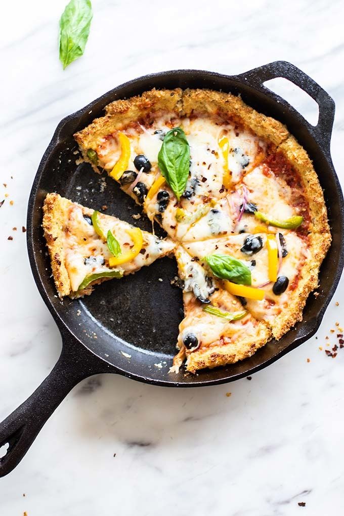 A cauliflower pizza crust recipe, perfect for baking deep dish style in a cast iron pan. This versatile low carb pizza recipe can be topped as desired! Instructions for baking in a cast iron pan or on a baking sheet are included.