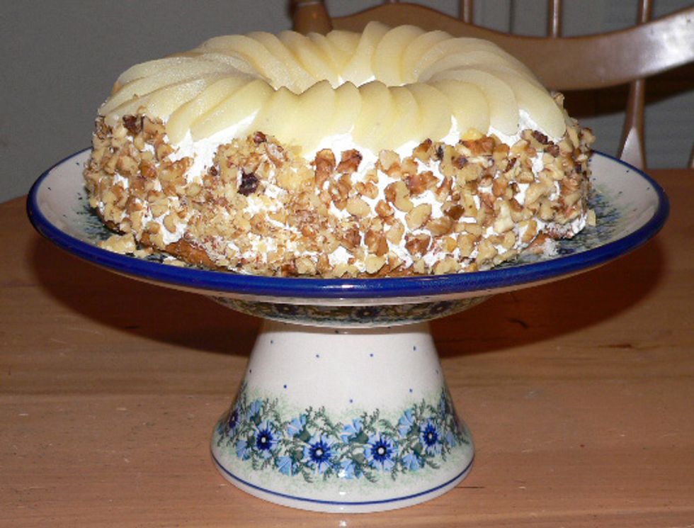 Heat oven to 350. Grease and flour 10" tube pan. Drain pear halves reserving 1/3C liquid. Place pear halves in food processor with metal blade, process until smooth. In large bowl combine cake mix, pureed...