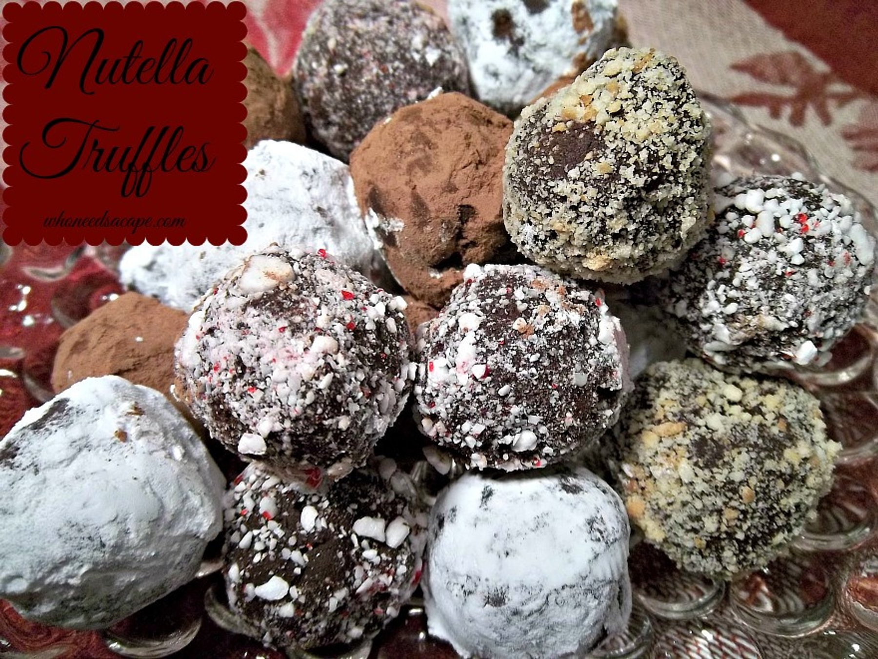 Oh yeah, you read that title right. Nutella Truffles = LOVE! This holiday season I decided to make truffles instead of fudge to give to friends, neighbors and to send to hubby’s work. Why? I don’t know – I am just wild and crazy that way. When I made the decision to make truffles instead of fudge I also decided I needed to “up” my truffle game. No plain Jane truffles for this gal. To the web I went looking. Oh my! I had no idea there were so many options when it came to truffles. I finally chose
