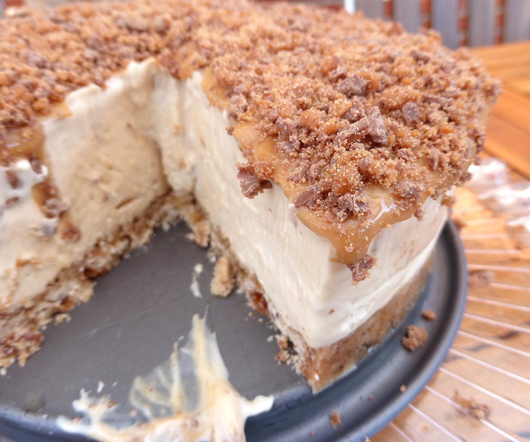 ~ Pre-heat the oven to 150°C (300°F) and grease a small spring-form cake tin (mine is 6 inches/ 18cm). Finely crush the Daim (or Health/Skor) bars using a food processor or blender and put to one side.