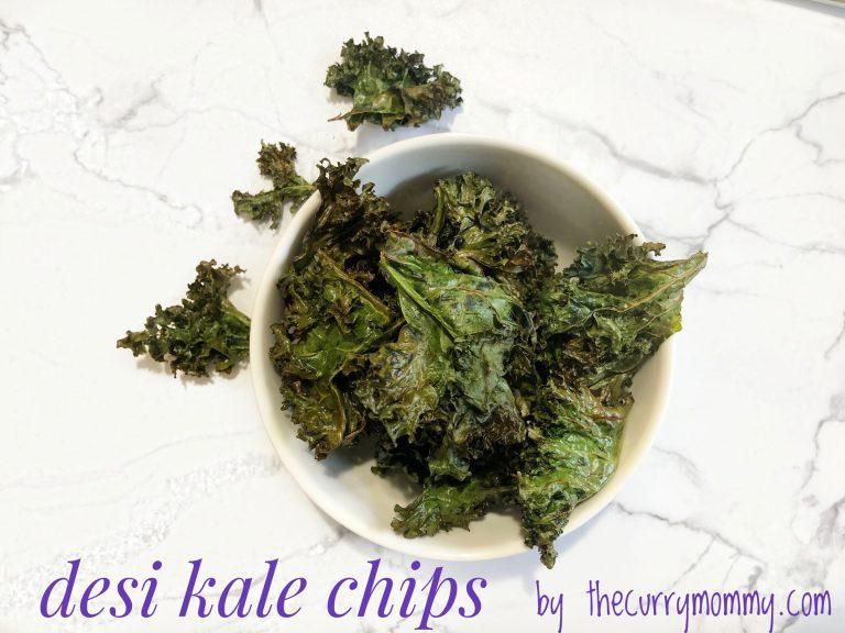 A baked kale chip with some added spices for an Indian twist to please those flavor loving palettes.