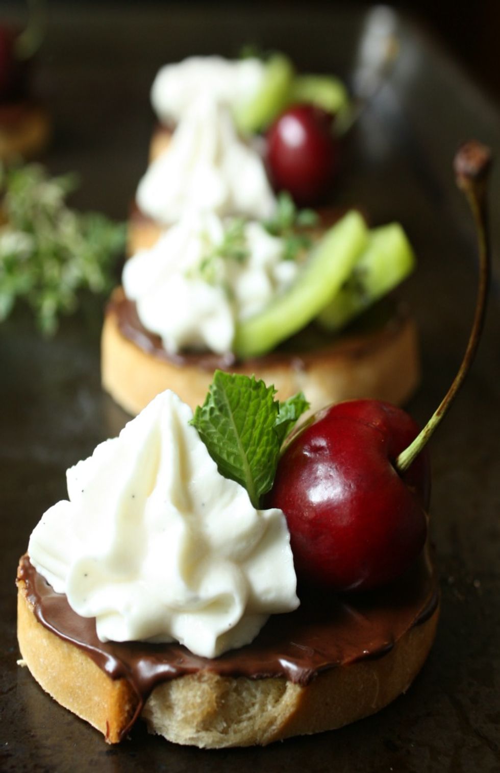 Toasted buttery bread spread with semi sweet chocolate and topped with fruit, freshly whipped heavy cream with vanilla bean paste, and aromatic herbs.
