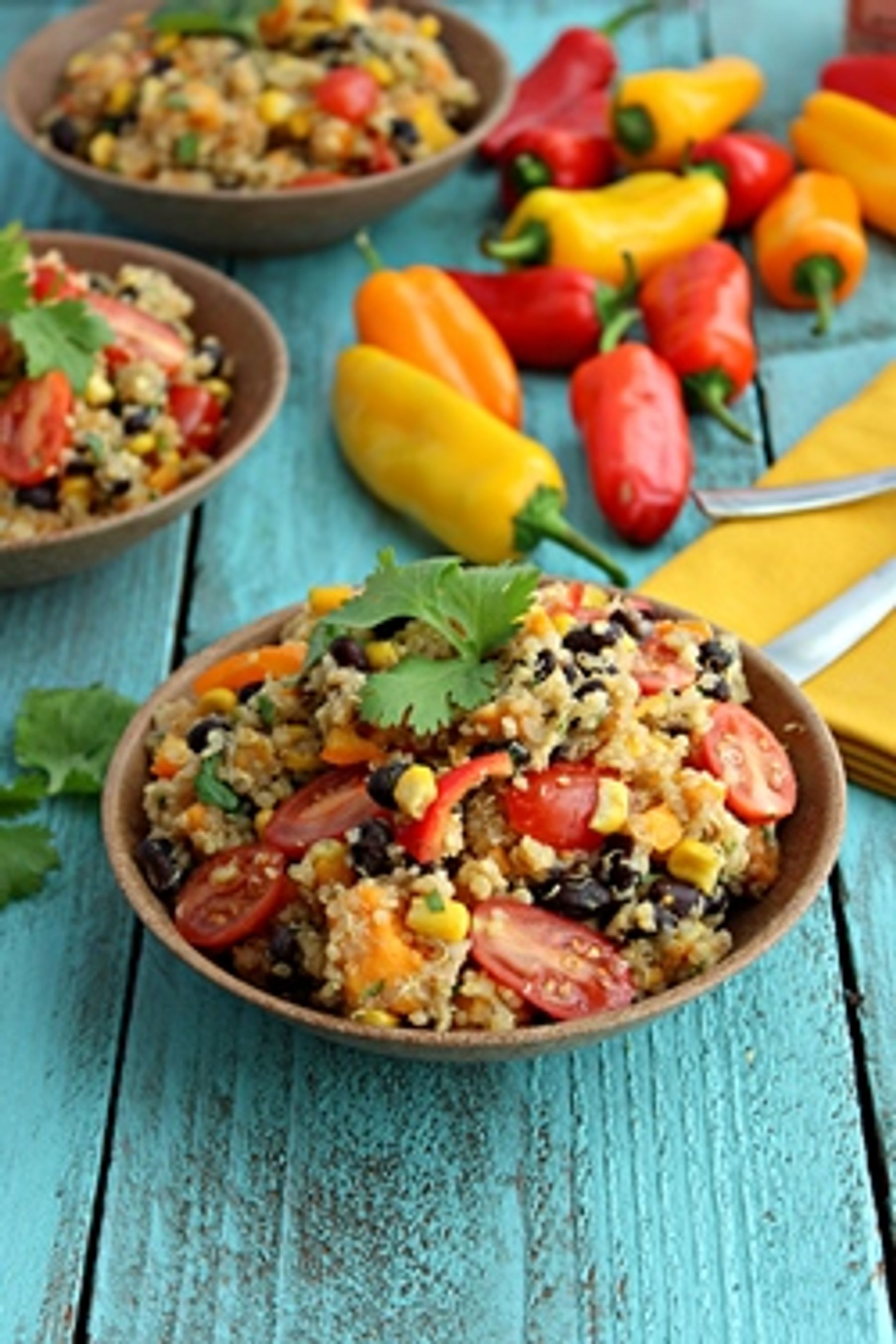 A detoxifying salad filled with quinoa, sweet potatoes, sweet bell peppers, corn, black beans, and cherry tomatoes.