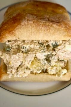Chicken salad made with cream cheese and dill pickles for a creamy and delicious salad.