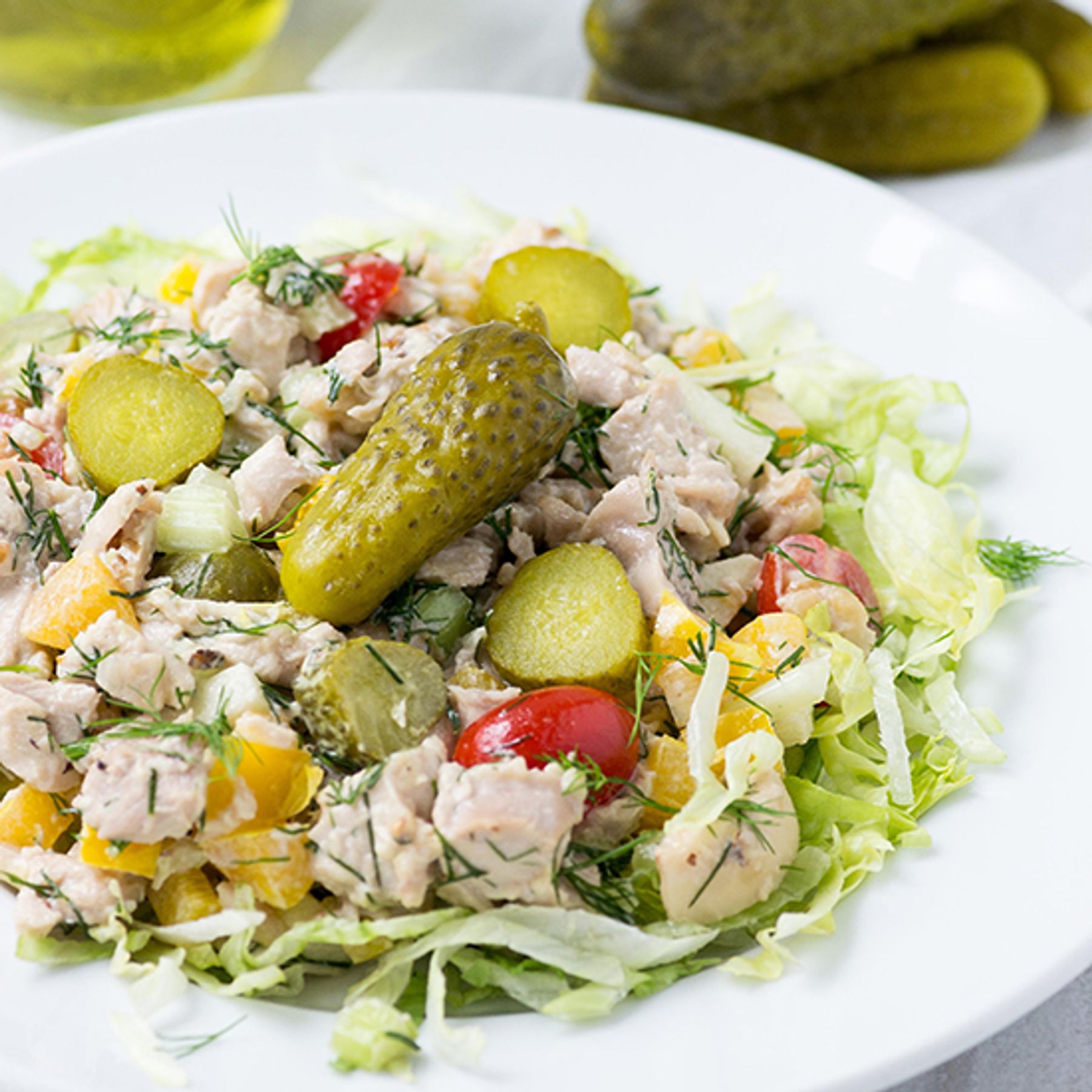 In a large mixing bowl combine the chicken, scallions, dill, walnuts, bell pepper, celery, apple, and pickles. Add...