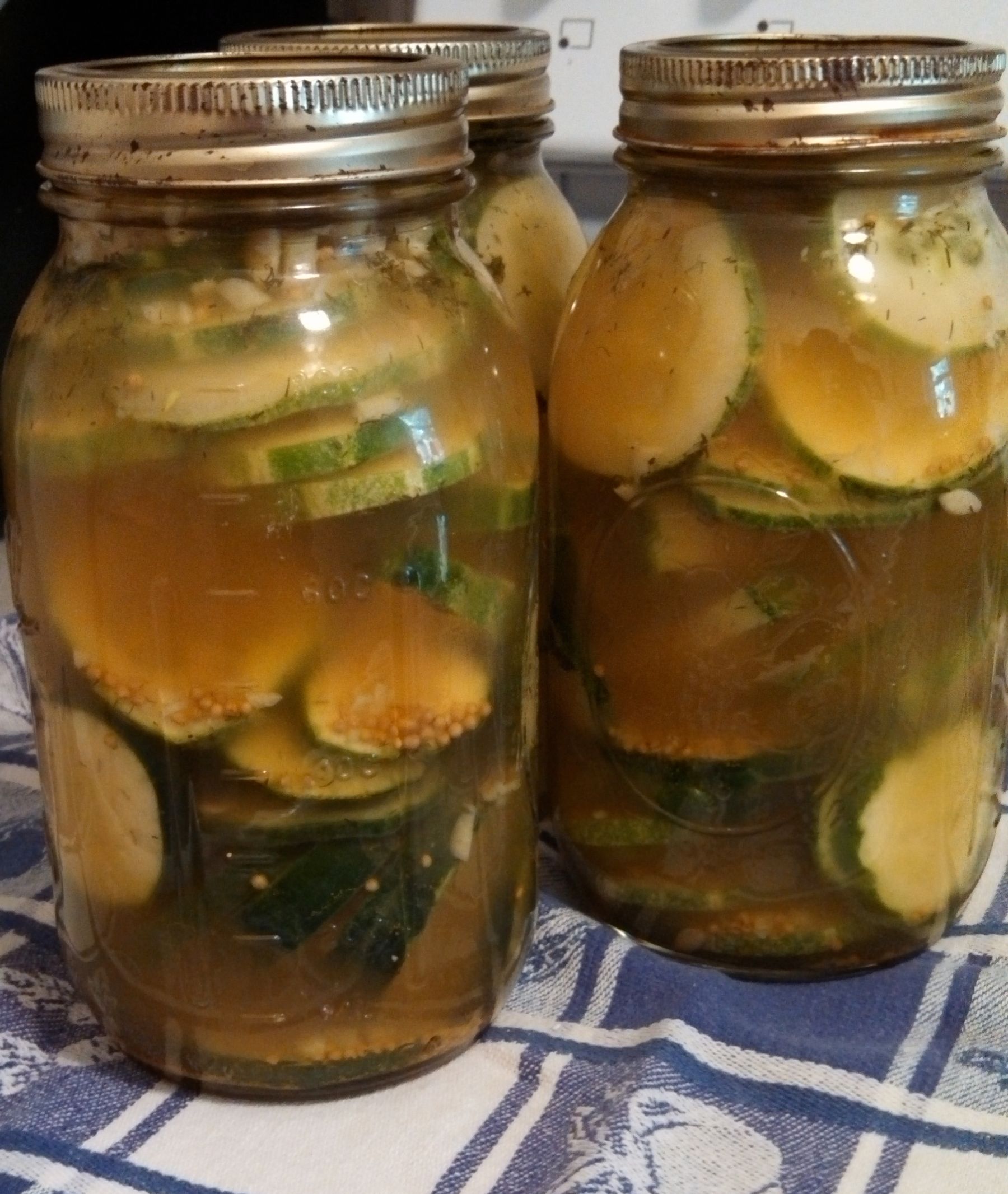Fill a 1 quart jar with cucumbers. Add the garlic, dried dill, turmeric and mustard seed. In a 4 cup glass measuring cup (or a bowl) combine the water, vinegar and salt. Microwave on high for 4-6 minutes...