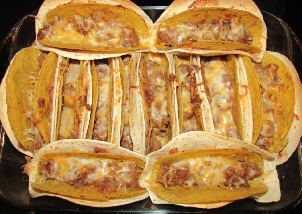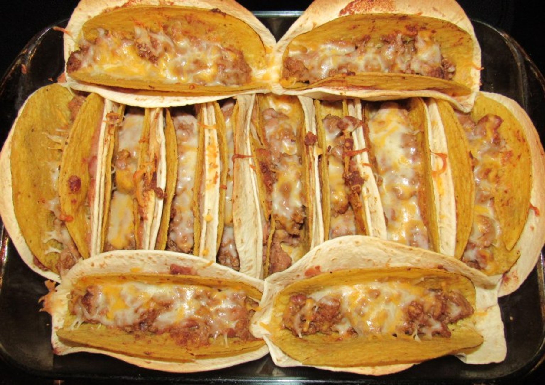 The easiest double decker tacos. Hard shells wrapped in refried beans, cheese, and a soft tortilla.