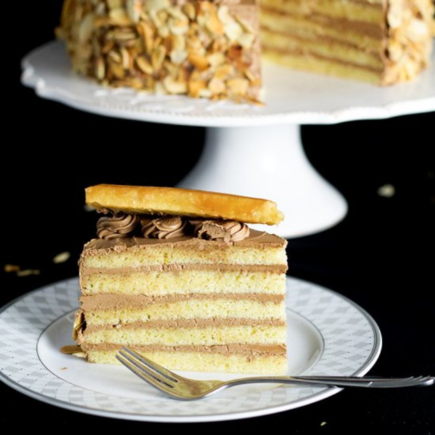 This amazing Hungarian layer cake has a fantastic buttery chocolate frosting and crazy caramel topping. Perfect for birthdays!