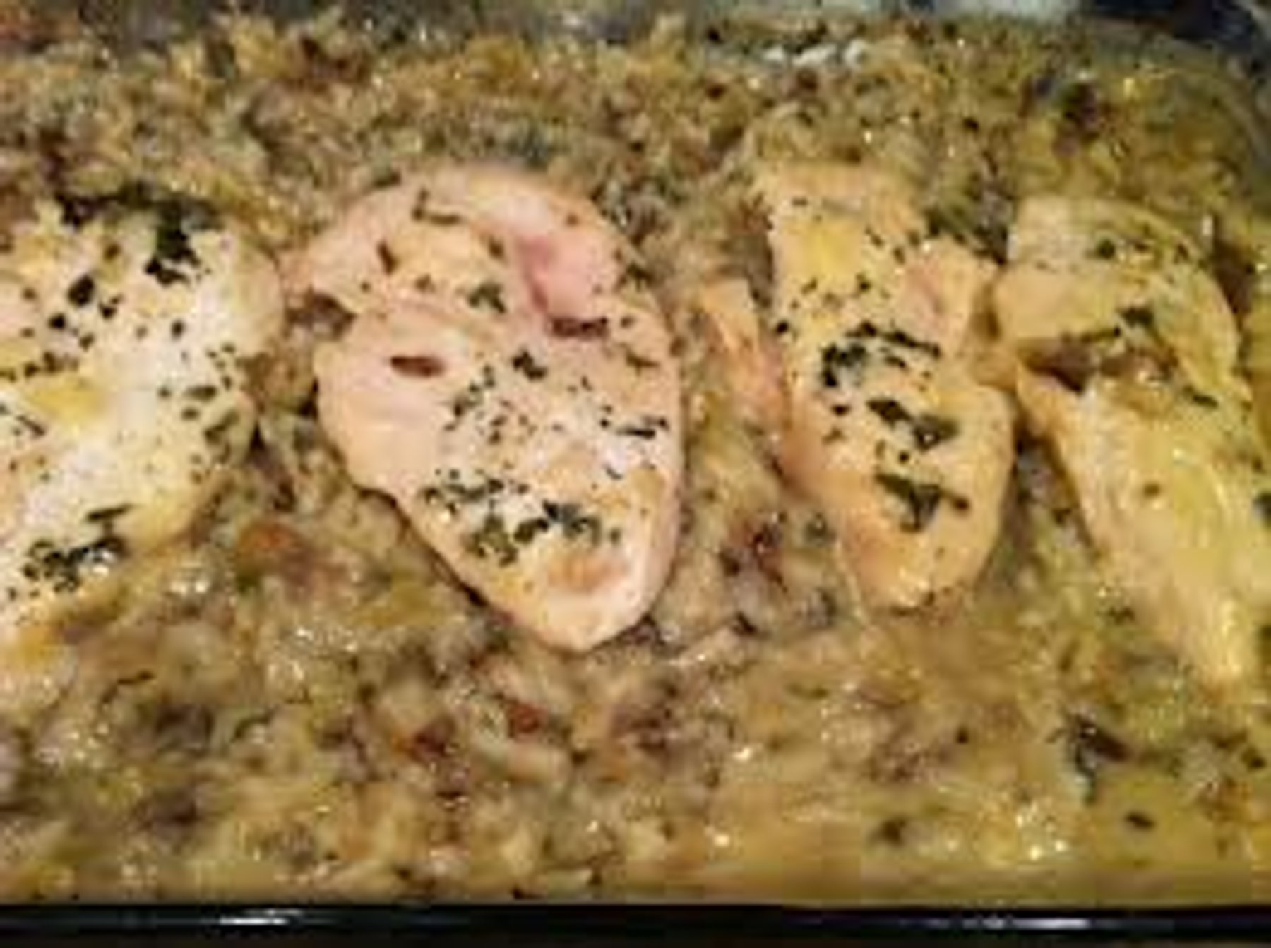 2. Mix rice, soups, water, garlic salt, and pepper together and put in casserole dish.