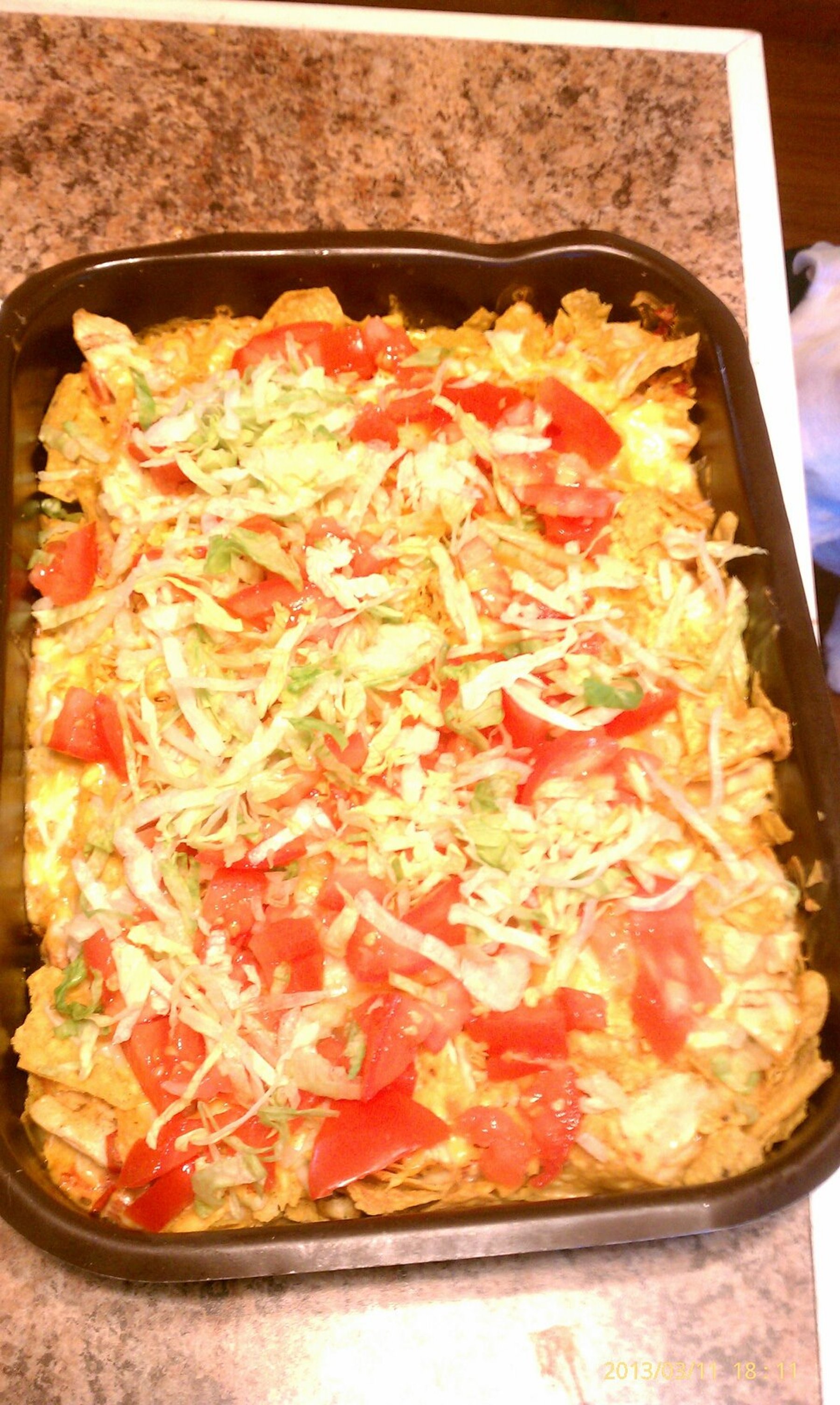 2. Grease a 2-quart casserole dish, and add a layer of crushed Doritos across the bottom. Top with a layer of the chicken mixture. Add another layer of crushed Doritos, and then add another layer of the chicken mixture. Top with remaining cheese. You can add more crushed Doritos on top as well if you wish.