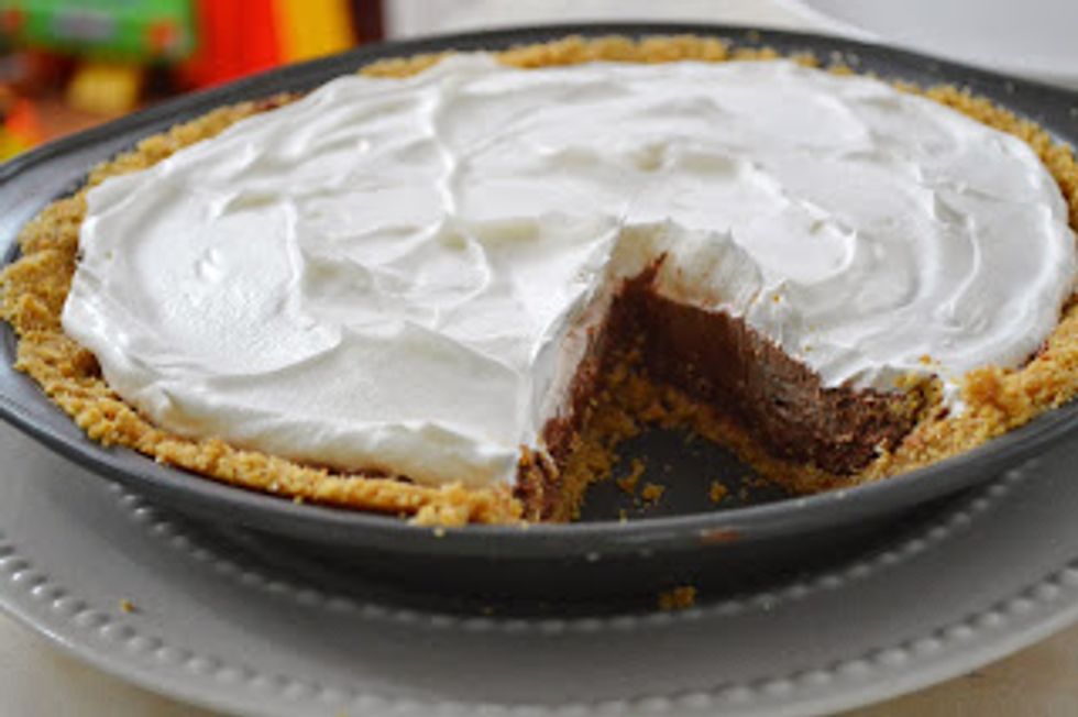 It's a no-bake dessert, including the crust...chocolate pudding, milk, cool whip - done!