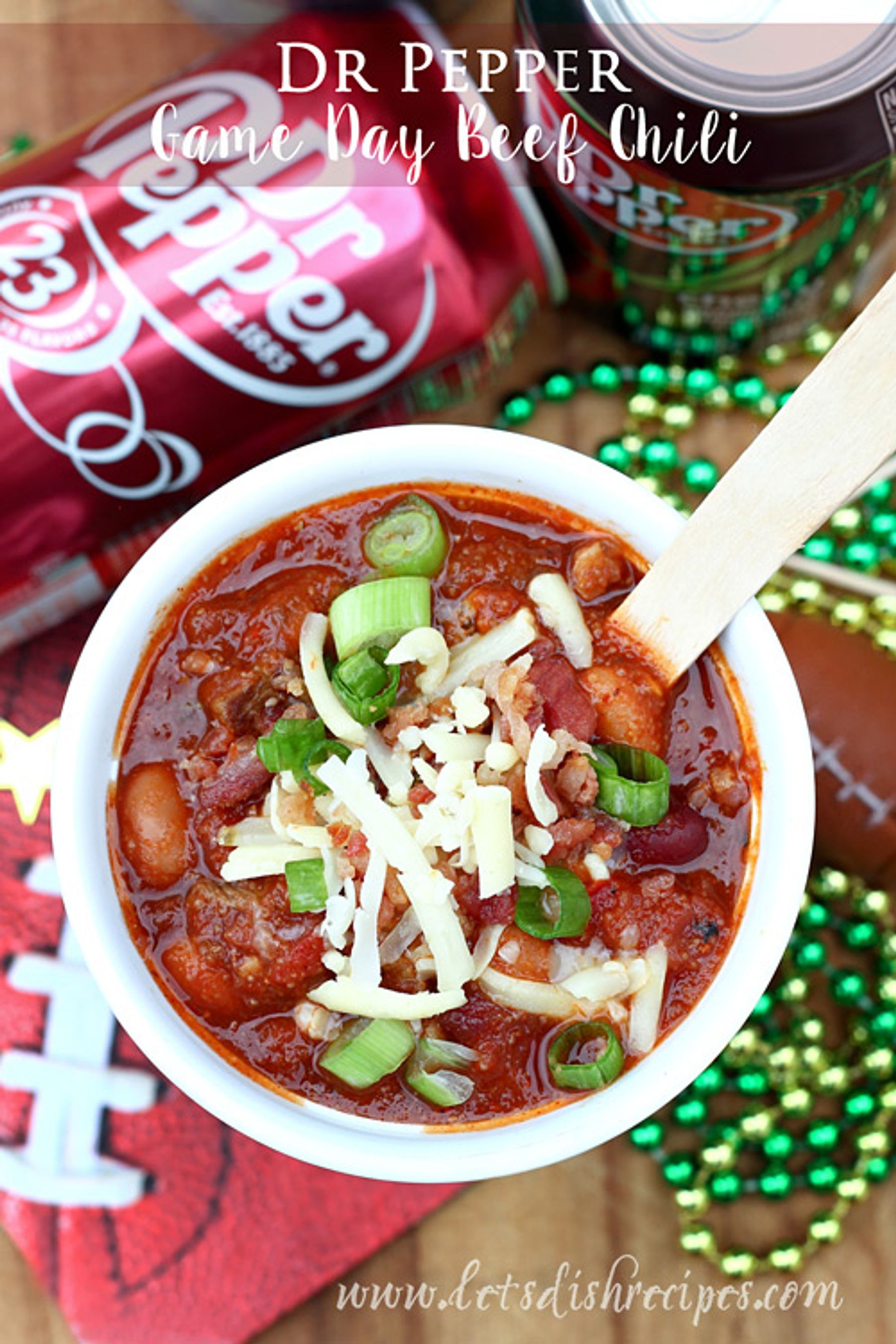 Hearty beef and bean chili with a Dr Pepper base. Perfect for feeding a crowd on game day!