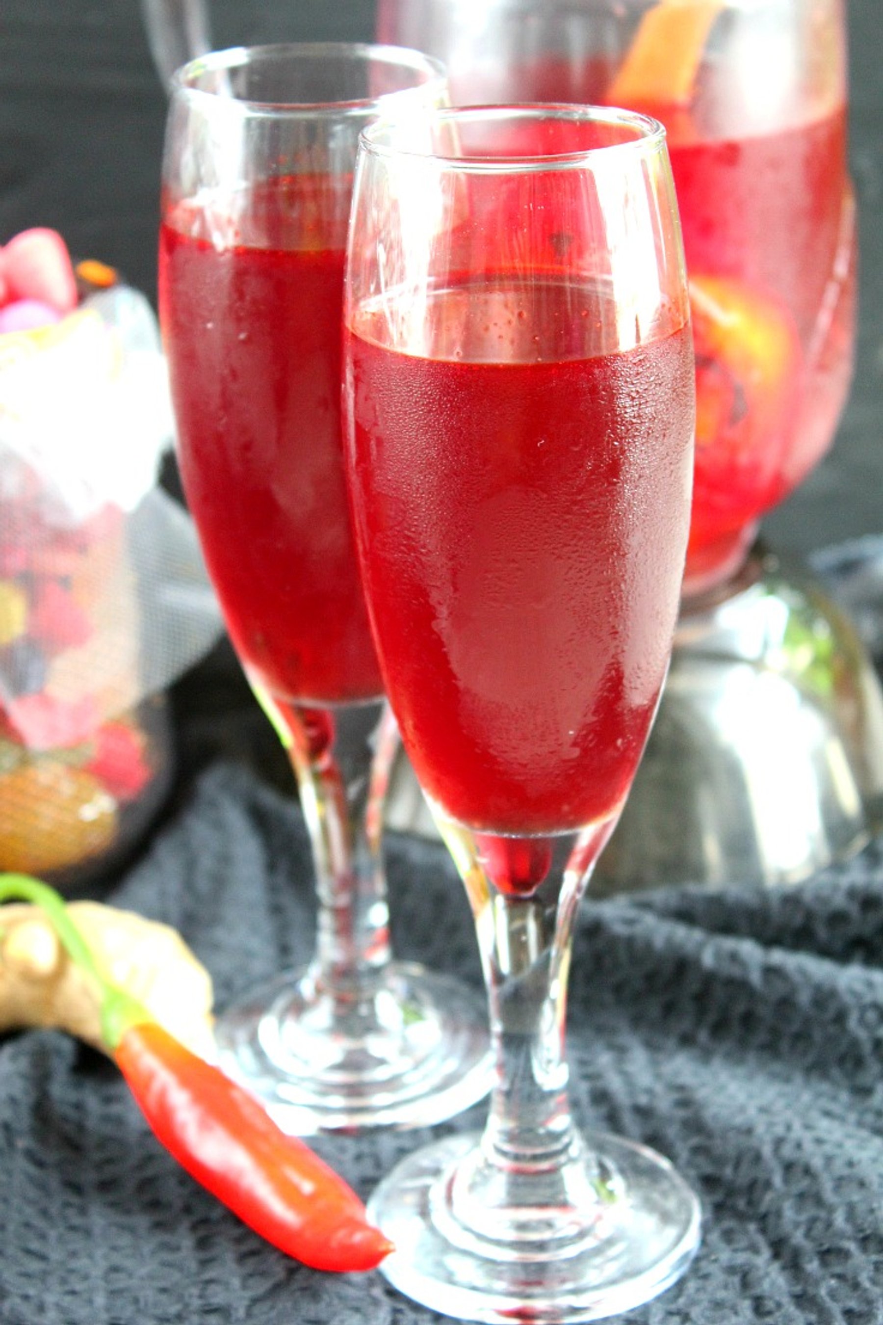 Pour the cherry juice into a large saucepan and add orange peel, chili, cinnamon sticks, cloves and ginger.
