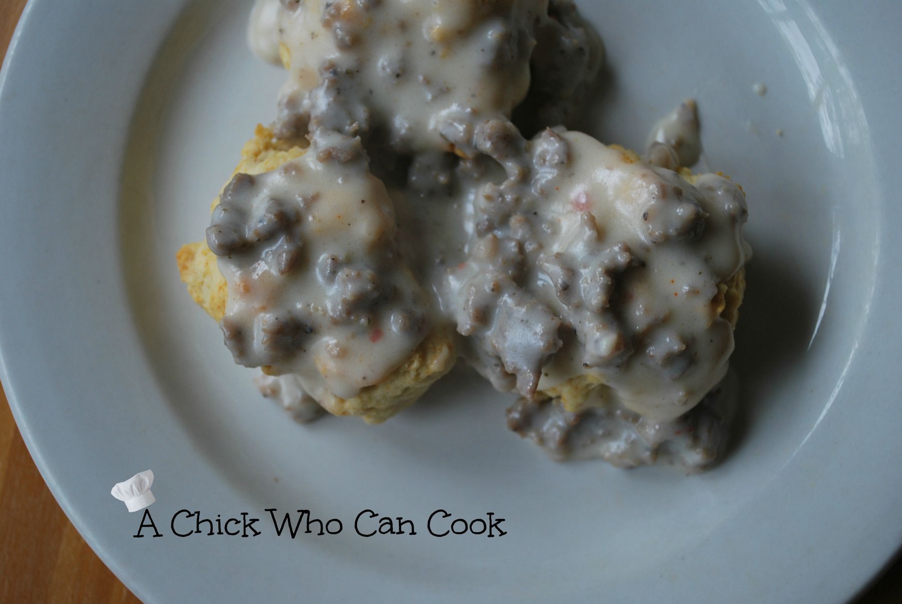This is one of our favorite recipes! I sat down thinking that I have never made this dish for breakfast only for dinner! The biscuits are flaky and dry which is perfect for the gravy!