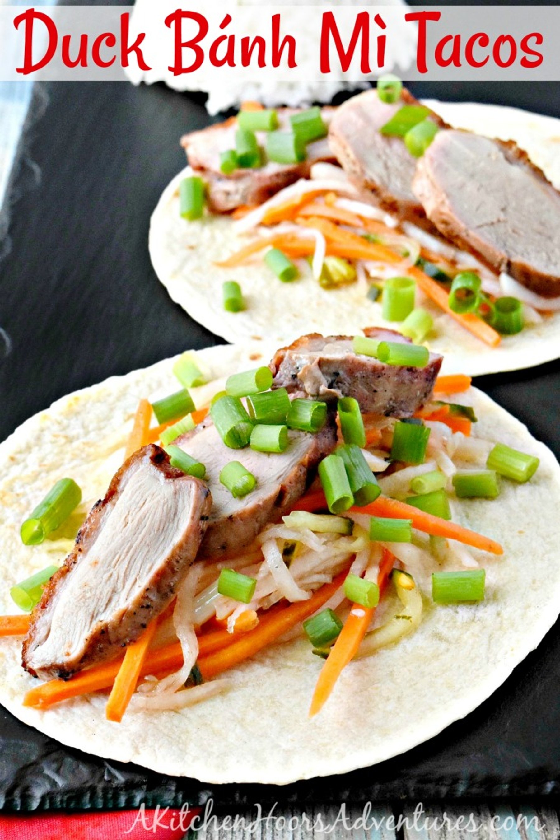 Tender and juicy Maple Leaf Farms duck is grilled up and serve on top of rich pate and quick pickled vegetables. Duck Bahn Mi Tacos are simple to make and taste so delicious! You can easily travel from your kitchen with this fun twist on duck, tacos, and bahn mi!