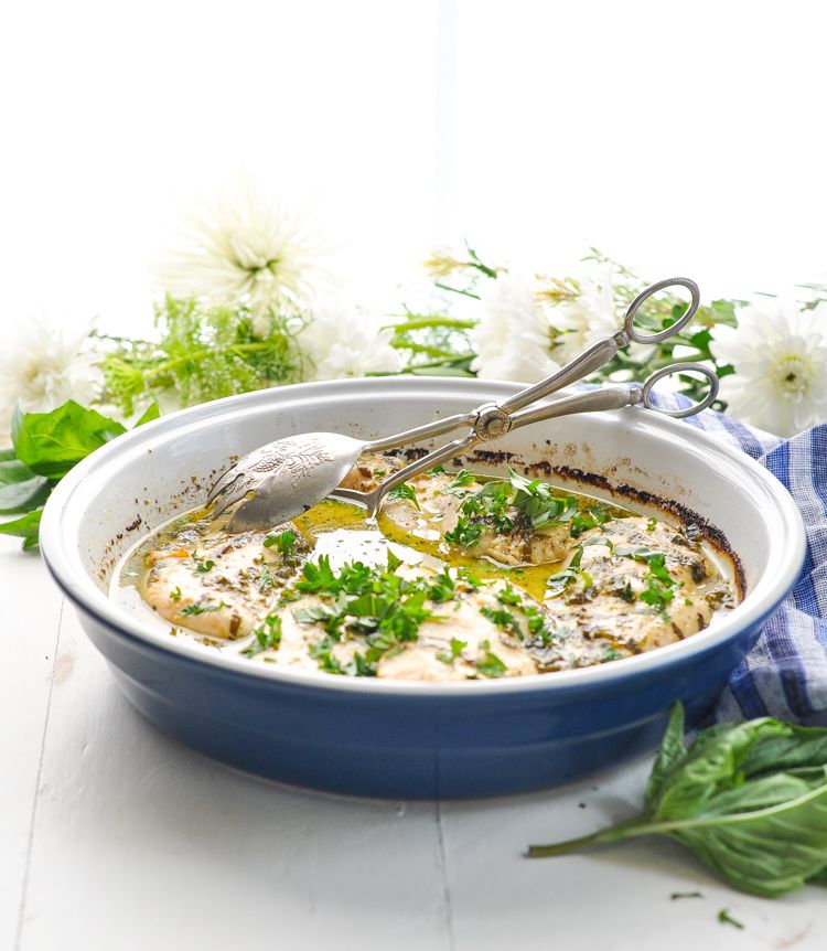 Serve a 5-minute delicious, easy, and healthy dinner with these Dump-and-Bake Basil Chicken Breasts! The tender, juicy chicken cooks in a flavorful white wine, Dijon, and fresh basil sauce for a versatile, low-calorie, and high-protein weeknight meal!