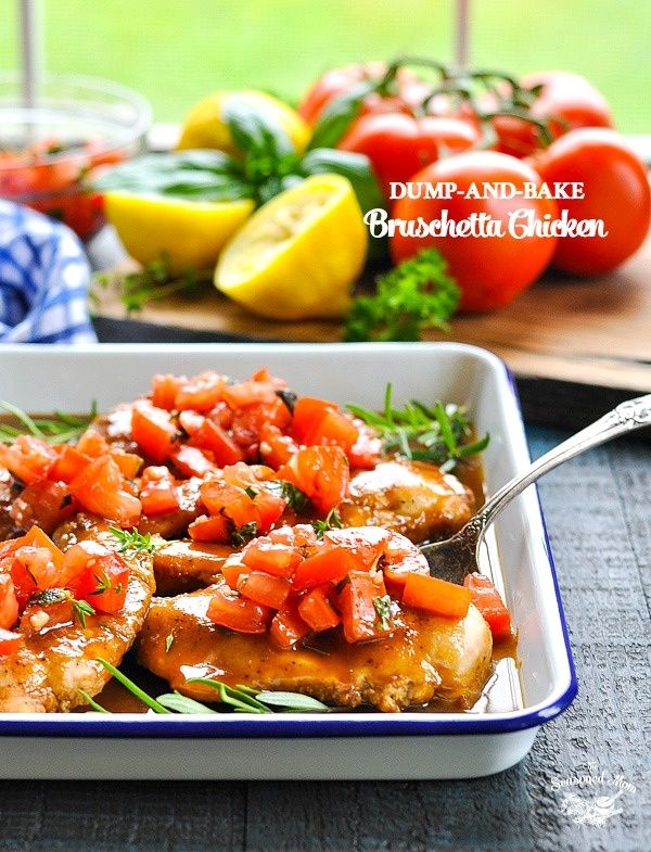 Your favorite tomato bruschetta tops tender and juicy balsamic chicken in this healthy Dump-and-Bake Bruschetta Chicken dinner! Full of simple ingredients and plenty of fresh flavors, it's a great way to enjoy summer's ripe tomatoes — in a nutritious and family-friendly meal.