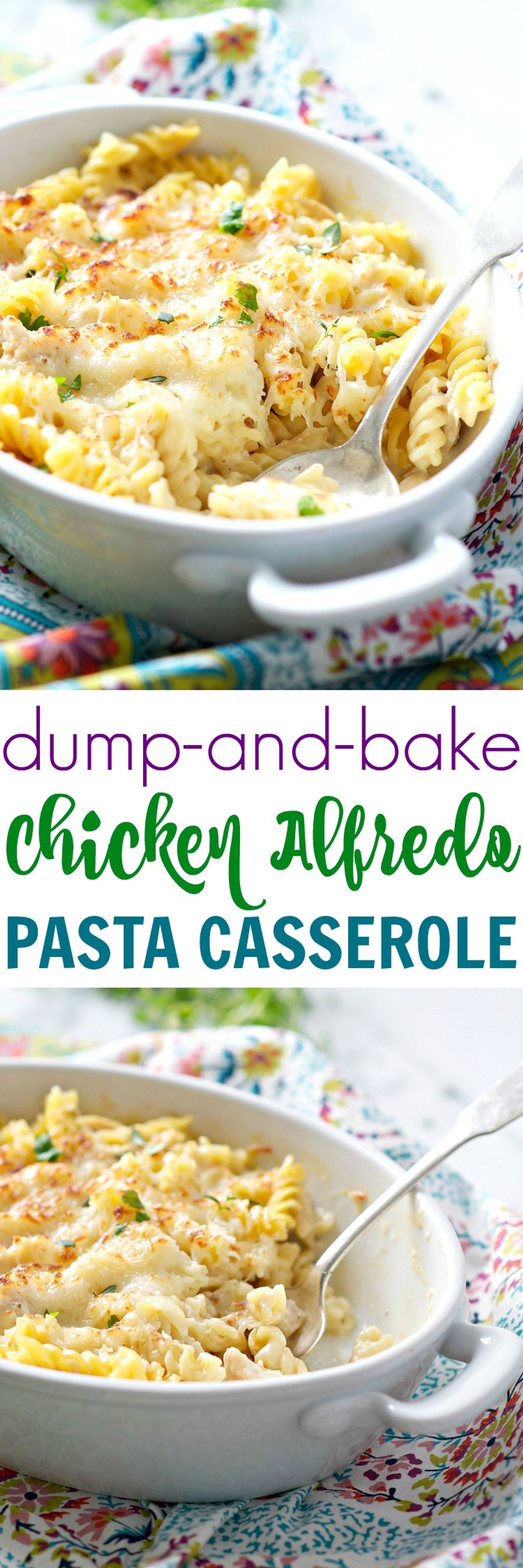 A 10-minute total crowd-pleaser, this Dump and Bake Chicken Alfredo Pasta Casserole is an easy, cheesy, comfort food dinner for your busiest weeknights — and you don’t even have to boil the pasta!