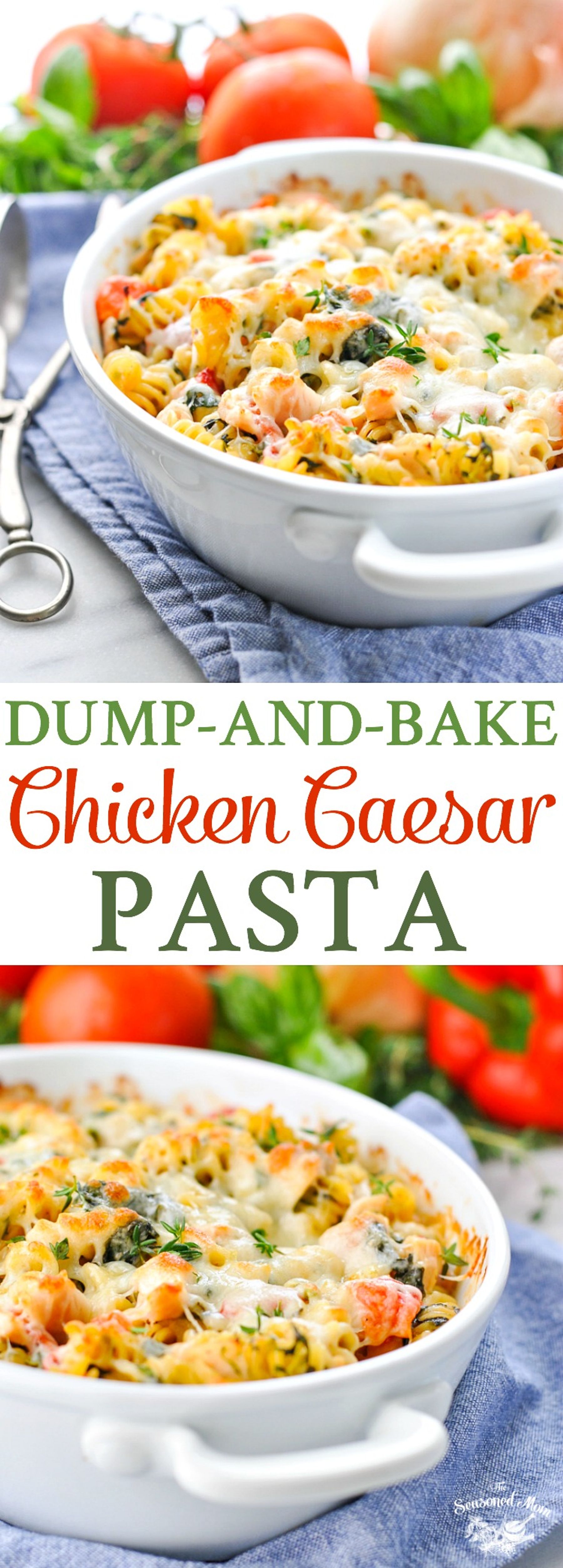 Easy dinner alert! There’s no need to even boil the pasta for this Dump-and-Bake Chicken Caesar Pasta! With spinach, roasted red peppers, and plenty of garlic, this creamy chicken casserole is a flavorful one dish meal that only requires about 10 minutes of prep.