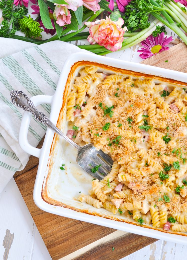 There's no need to boil the pasta! Just dump-and-bake for this easy 10-minute Chicken Cordon Bleu Casserole! The creamy Swiss cheese pasta is loaded with chicken and ham, and finished with a buttery breadcrumb topping. It's a one-dish meal that your family will adore!