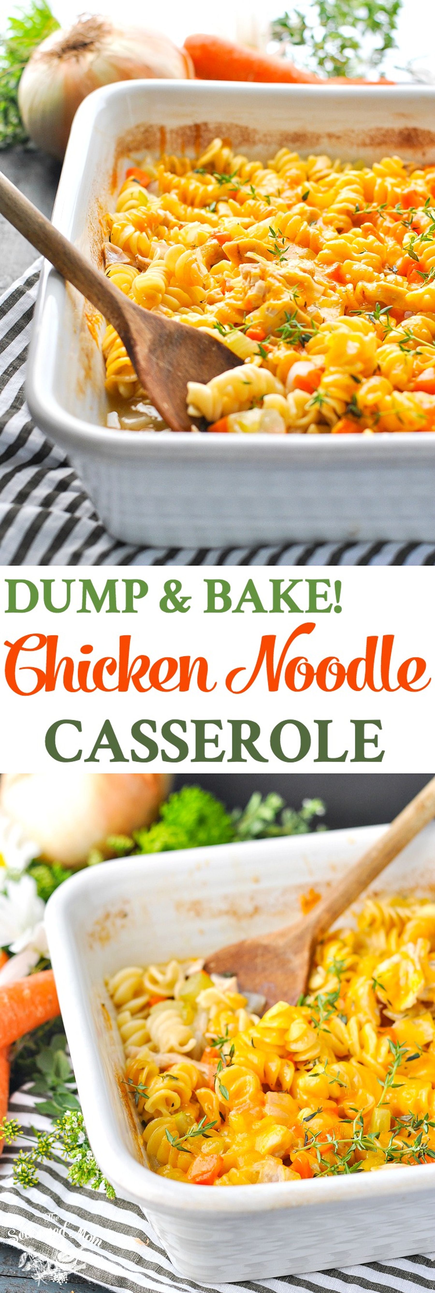 You don’t even have to boil the pasta for this nutritious and cozy Dump-and-Bake Chicken Noodle Casserole! All of the ingredients cook together in one dish for a simple comfort food dinner on a cool evening!