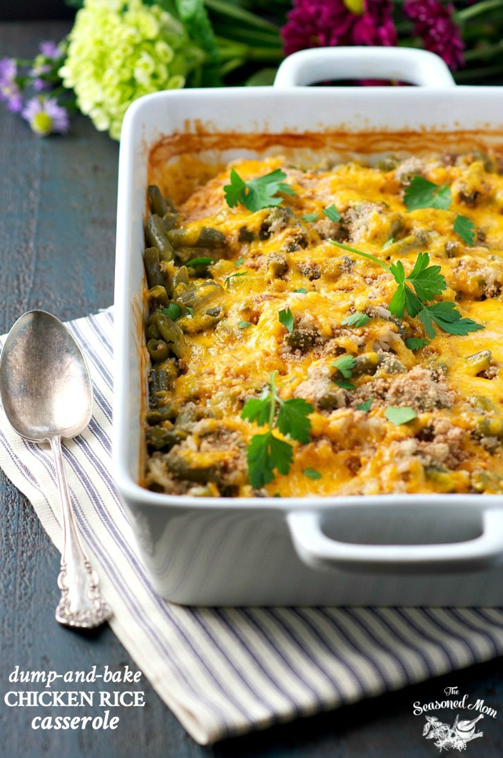 You only need 5 minutes to prepare this Dump-and-Bake Chicken Rice Casserole -- an easy dinner that cooks in one dish!