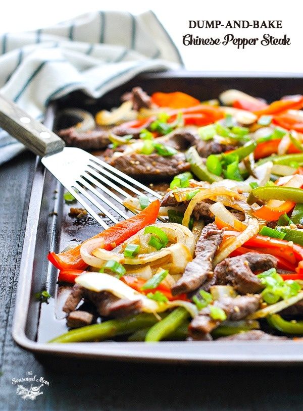 This Dump-and-Bake Chinese Pepper Steak is an easy and healthy sheet pan dinner recipe that comes together with just 10 minutes of prep! It's lighter, tastier, and faster than your favorite restaurant takeout.