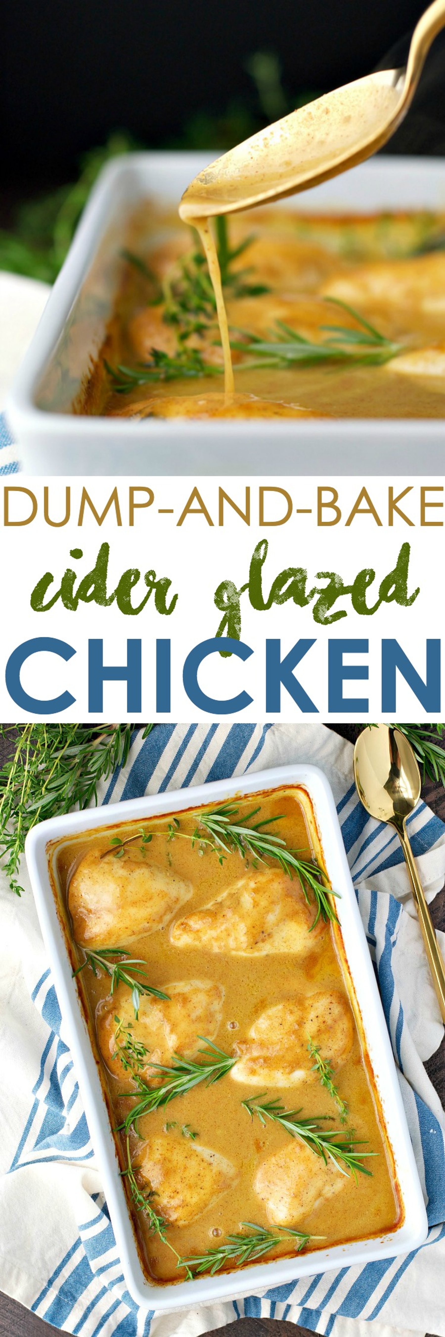 Made with wholesome ingredients, this Dump and Bake Cider Glazed Chicken is an easy 30-minute meal for those nights when you just don’t feel like cooking! There’s no prep work necessary for a healthy dinner!