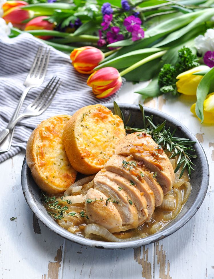 With just 10 minutes of prep, this Dump-and-Bake French Onion Chicken is an easy dinner recipe that wins the stamp of approval from even the pickiest little kids! Serve the juicy chicken breast and the caramelized onions in their rich broth with a side of cheesy bread for a fun twist on the classic soup!