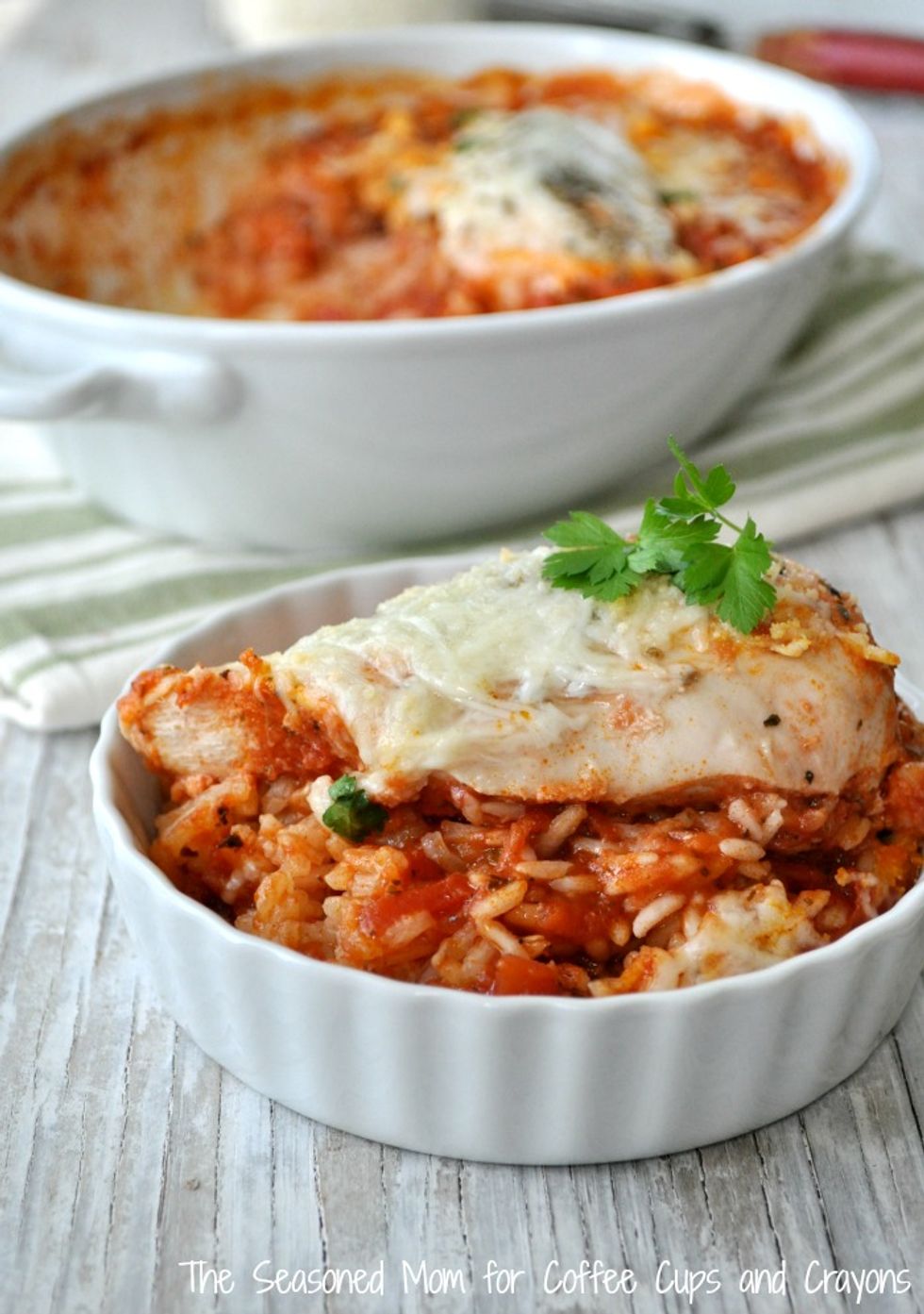 This Dump and Bake Italian Chicken and Rice is an easy and healthy dinner recipe that comes together in about 10 minutes! Even the rice cooks in the dish, making this a fast and wholesome casserole to please even the pickiest little eaters.
