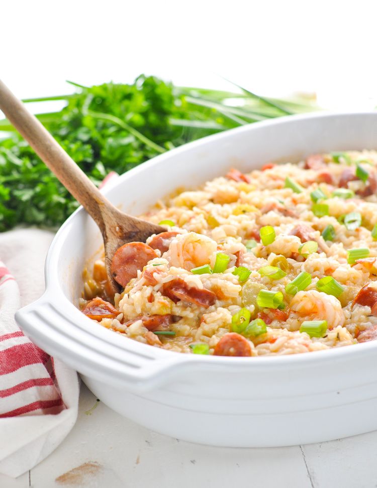 There's no prep work necessary! Just stir the raw ingredients together in a dish and pop it in the oven for an easy Dump-and-Bake Jambalaya. This Cajun-inspired meal is full of Andouille sausage, shrimp, rice and veggies for a taste of the South — even on your busiest weeknights!