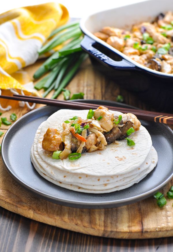 This Dump-and-Bake Moo Shu Chicken is a lighter, healthier version of the Chinese restaurant classic. With just one dish and about 10 minutes of prep, it's an easy dinner recipe that's even better than take-out!