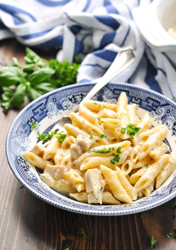 You don't even have to boil the pasta! A simple, creamy Parmesan Pasta with Chicken is ready for the oven with just 10 minutes of prep! This family-friendly meal is an easy dinner recipe that kids and adults will both enjoy.