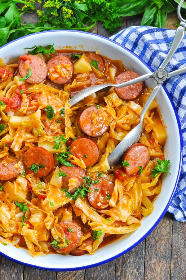 - Place cabbage, onion, potatoes, sausage, garlic, salt, and diced tomatoes in the...