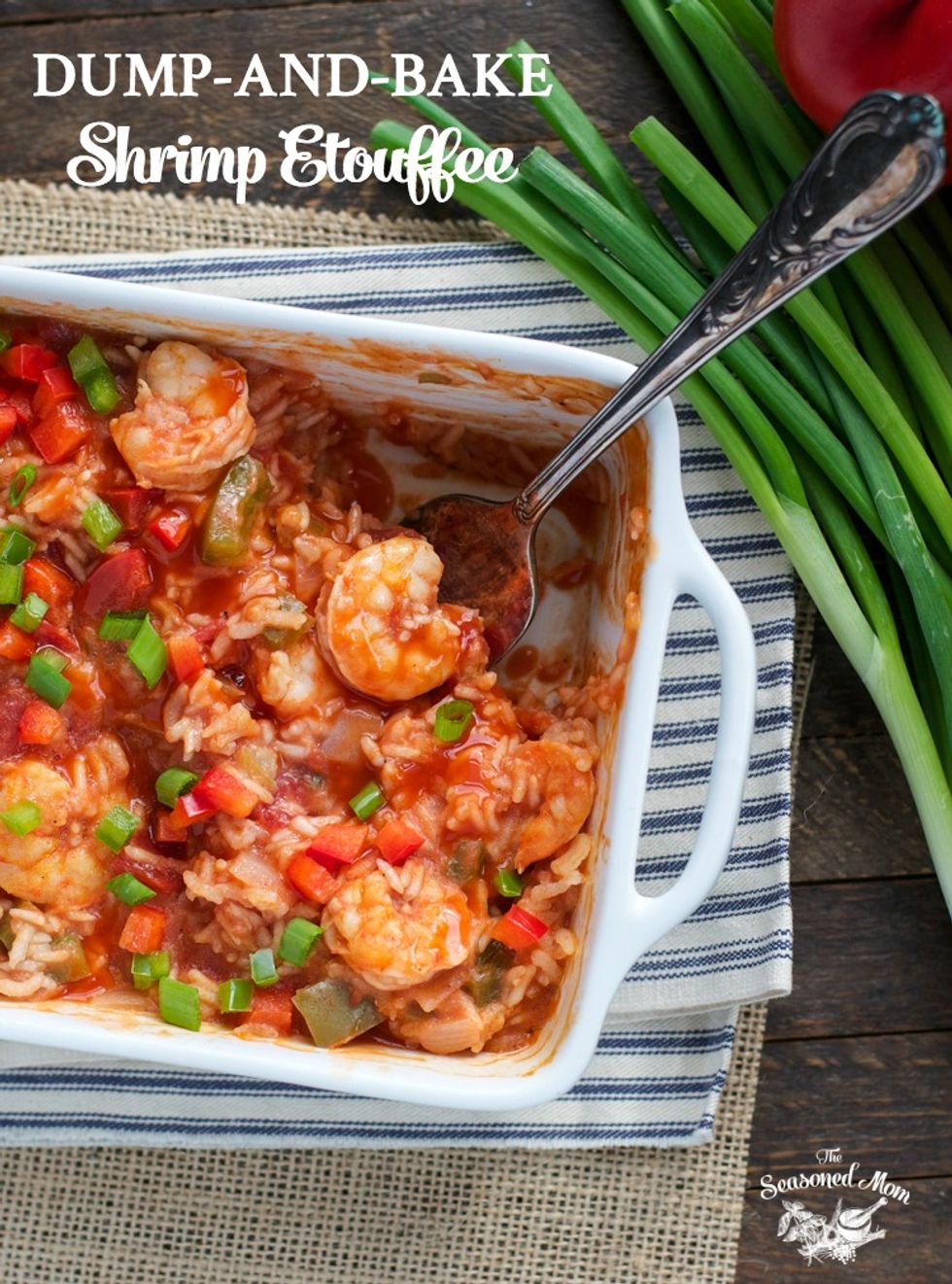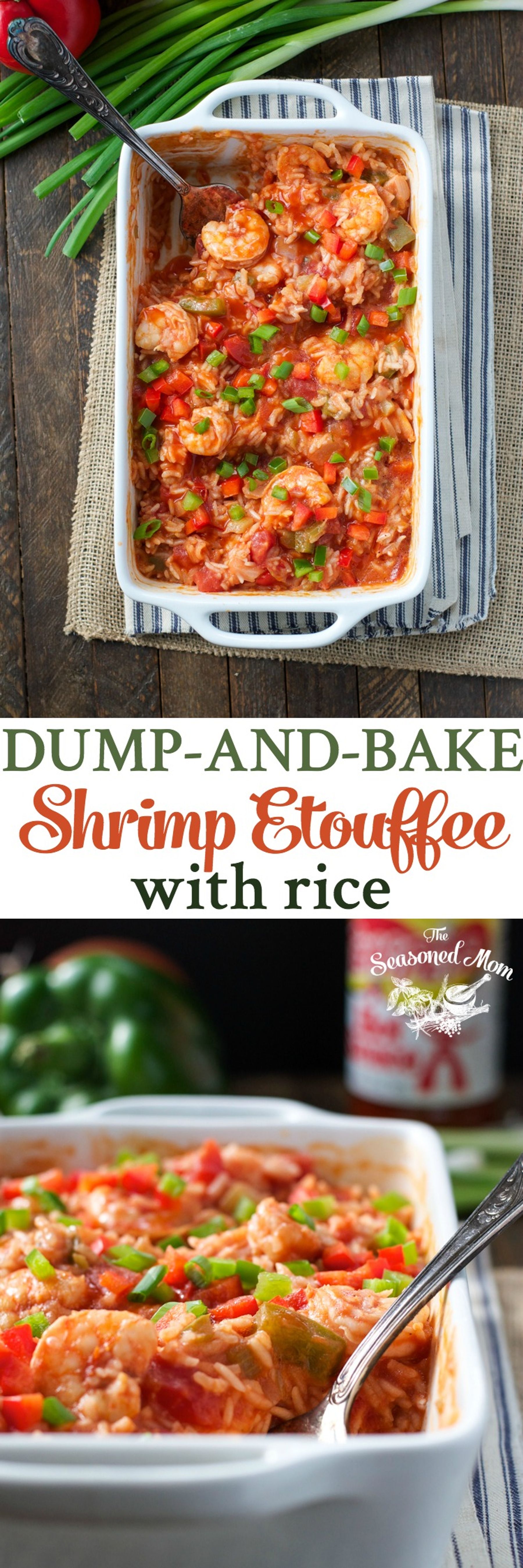 This Dump-and-Bake Shrimp Etouffee is the ultimate Southern comfort food! The raw veggies, uncooked shrimp, and uncooked rice all bake together in one dish for an easy dinner that’s ready with only 10 minutes of prep. It’s family-friendly Cajun food — just in time for Mardi Gras!