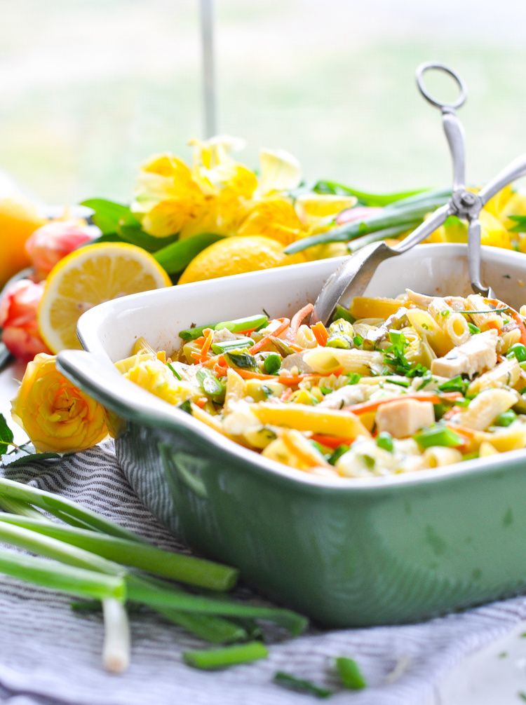 Pasta is baked with chicken and all of spring's finest vegetables for a light and healthy one pot meal! With asparagus, artichokes, carrots, peas, and chives, this easy Dump-and-Bake Spring Pasta has all of the fresh flavors that you crave — with just 10 minutes of prep. You don't even have to boil the pasta!