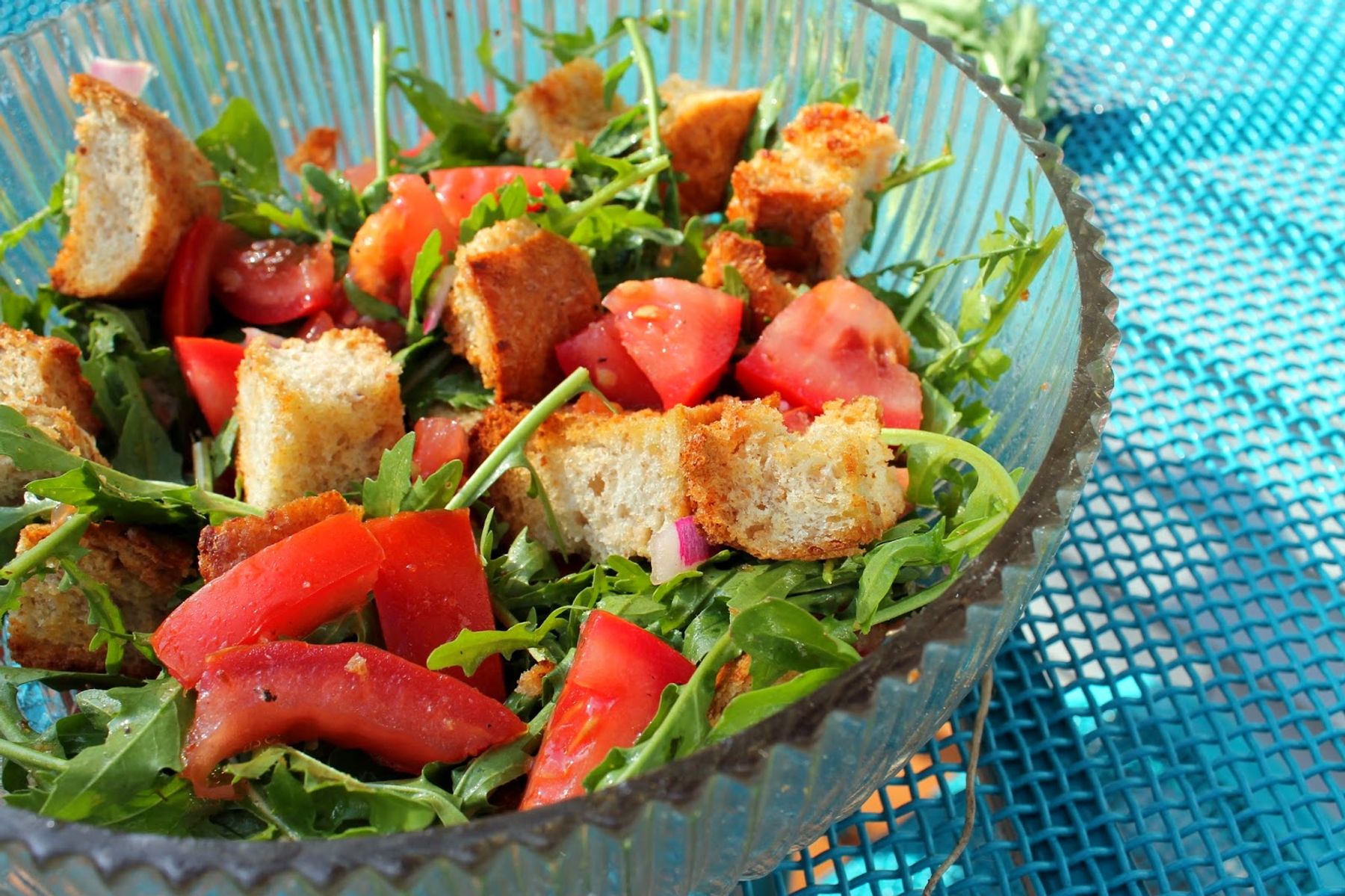A nice warm panzanella with fresh garden produce and a big glass of white wine and you pretty much have made heaven right there.