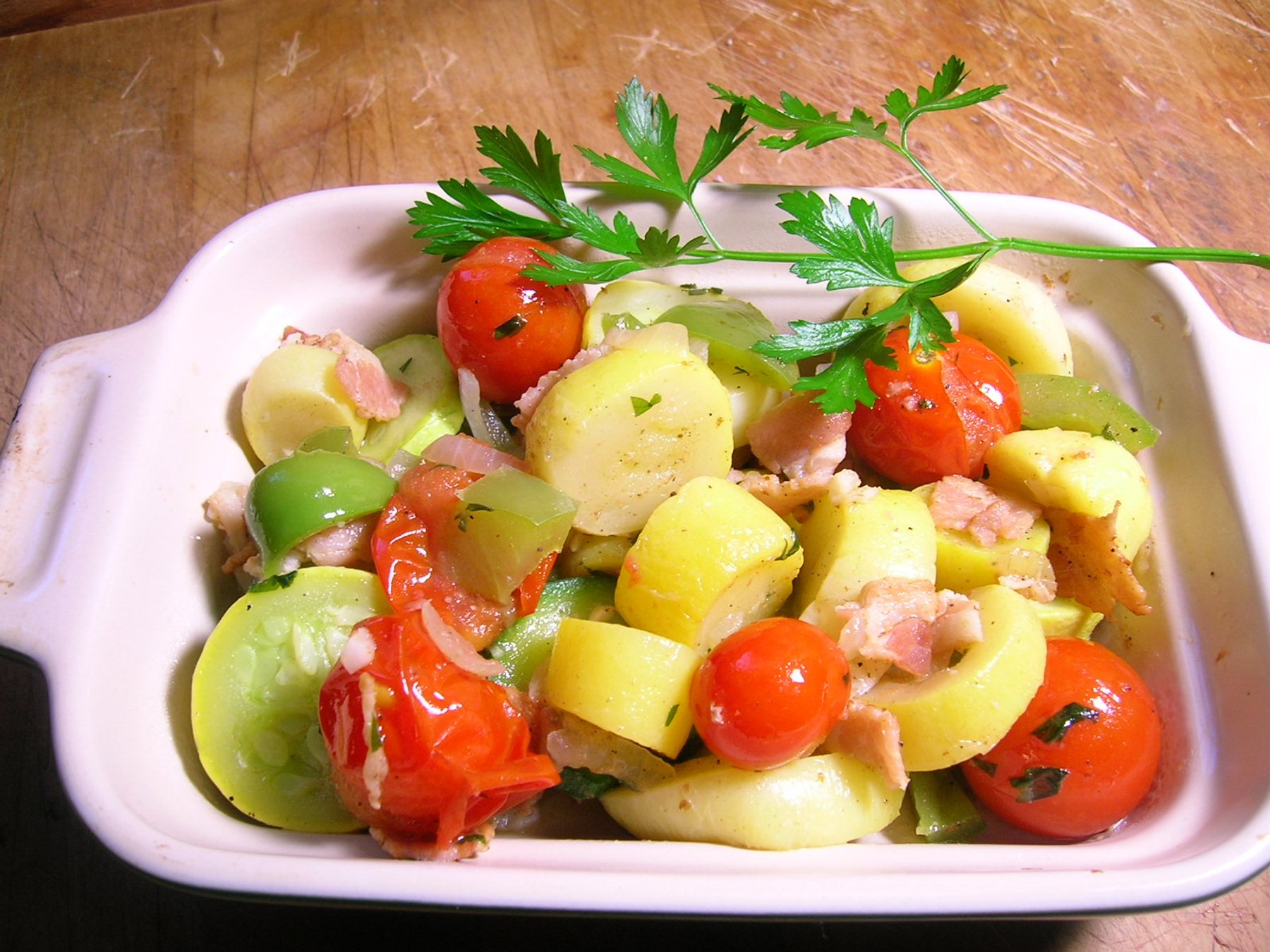 A great way to start using some of the early summer vegetables out of your garden! Yellow squash with peppers and cherry tomatoes and fresh herbs. Simple to make and so fresh!