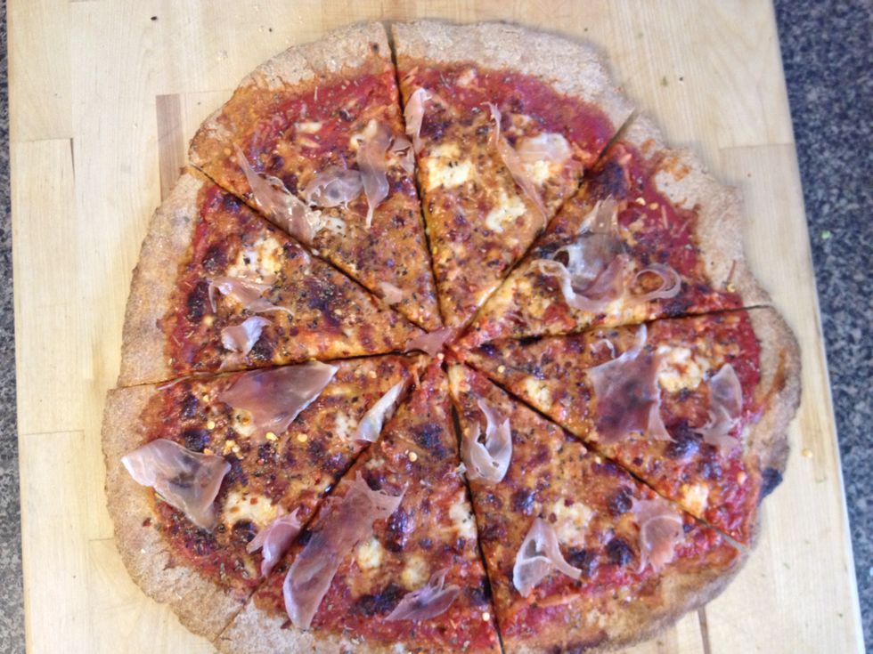 This pizza dough is healthy and delicious. It's got the perfect amount of crunch on the bottom and a nice texture throughout. I like to top it with strong cheeses, earthy mushrooms, truffle oil, prosciutto, and crushed red pepper on top.