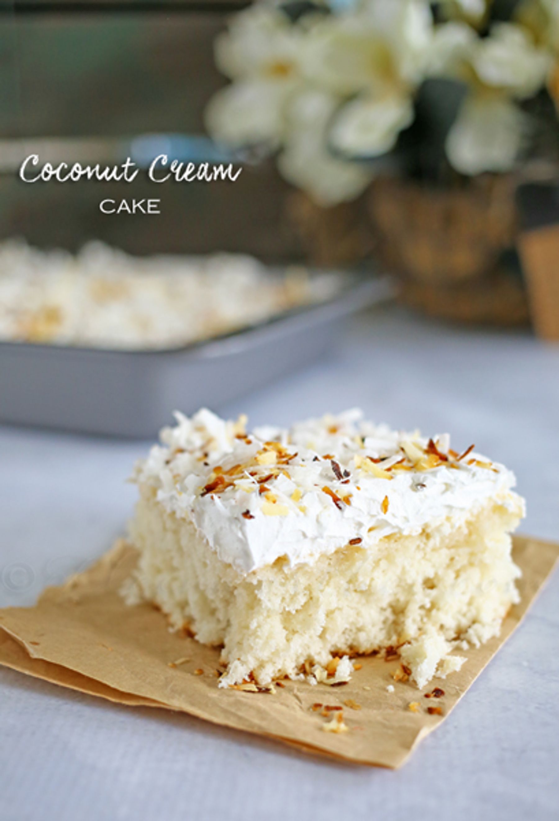 Light & fluffy coconut cake topped with creamy whipped cream & homemade toasted coconut