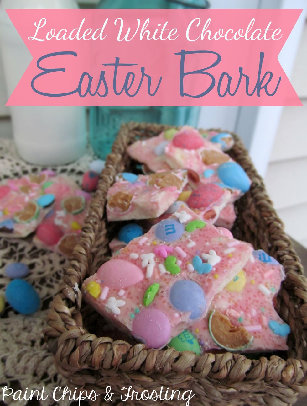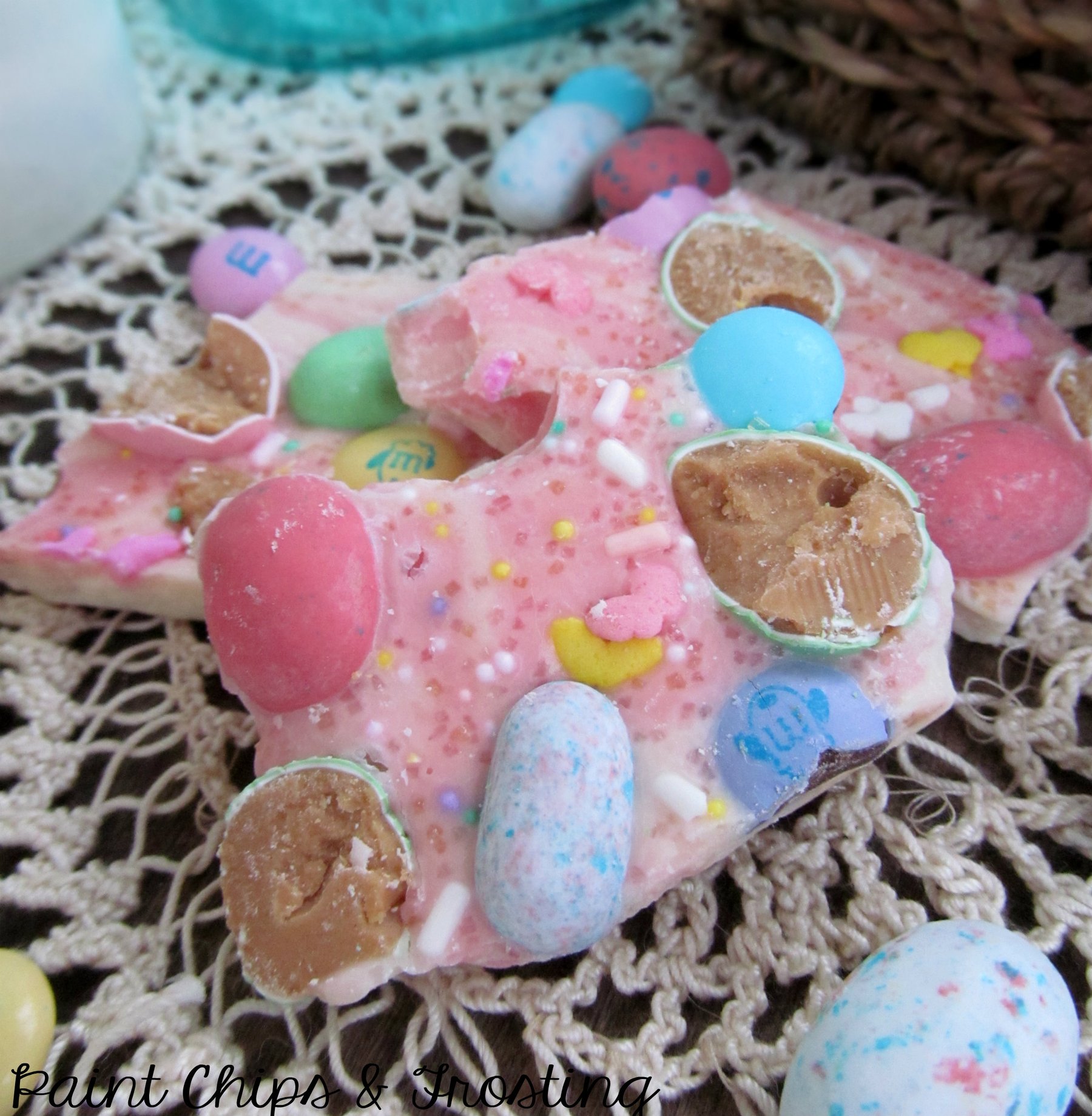 White Chocolate Bark loaded with Reese’s eggs, milk chocolate m&ms and Robins eggs.