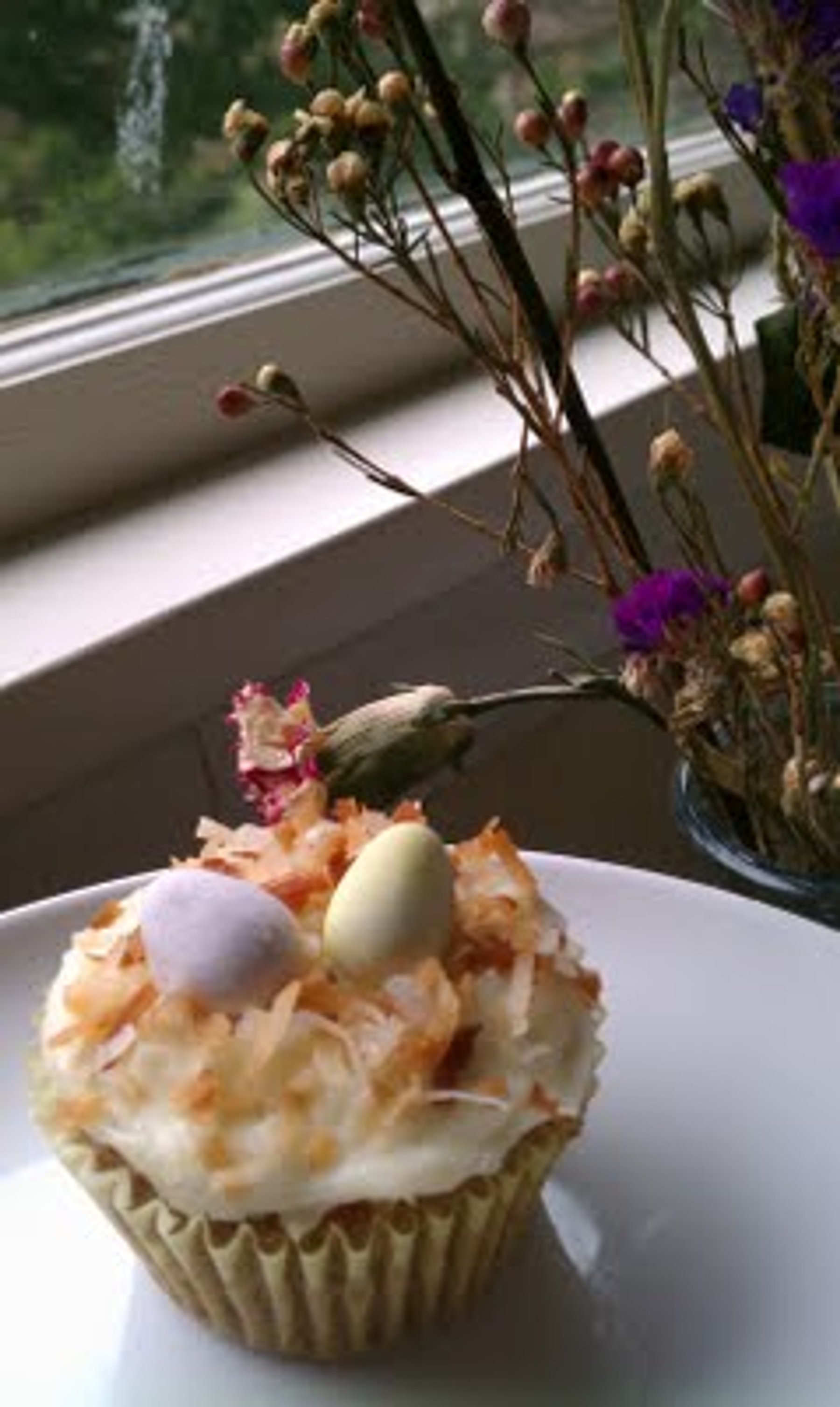 A moist, spiced carrot cake cupcake topped with a rich cream cheese frosting and finished with a nest of toasted coconut and chocolate eggs. The cutest Easter dessert you'll find!