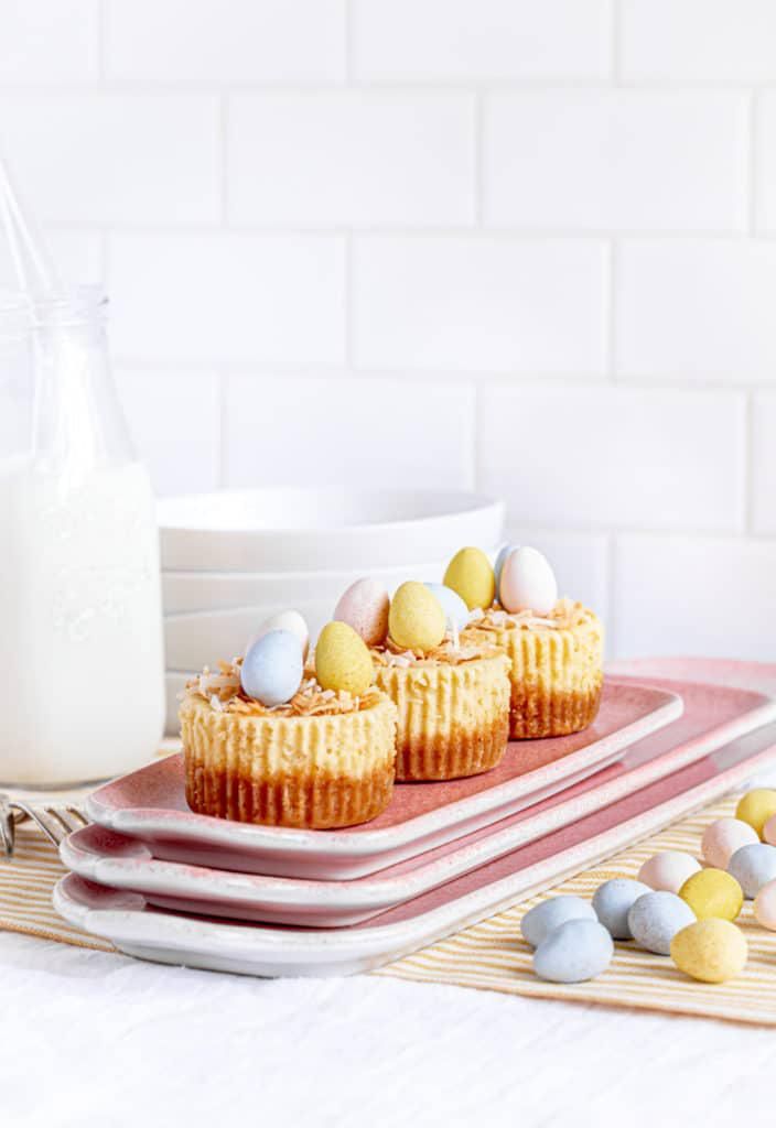 These Easter cheesecake bites feature an adorable bird's nest topping with candy eggs. It's an easy recipe for the best mini cheesecakes!
