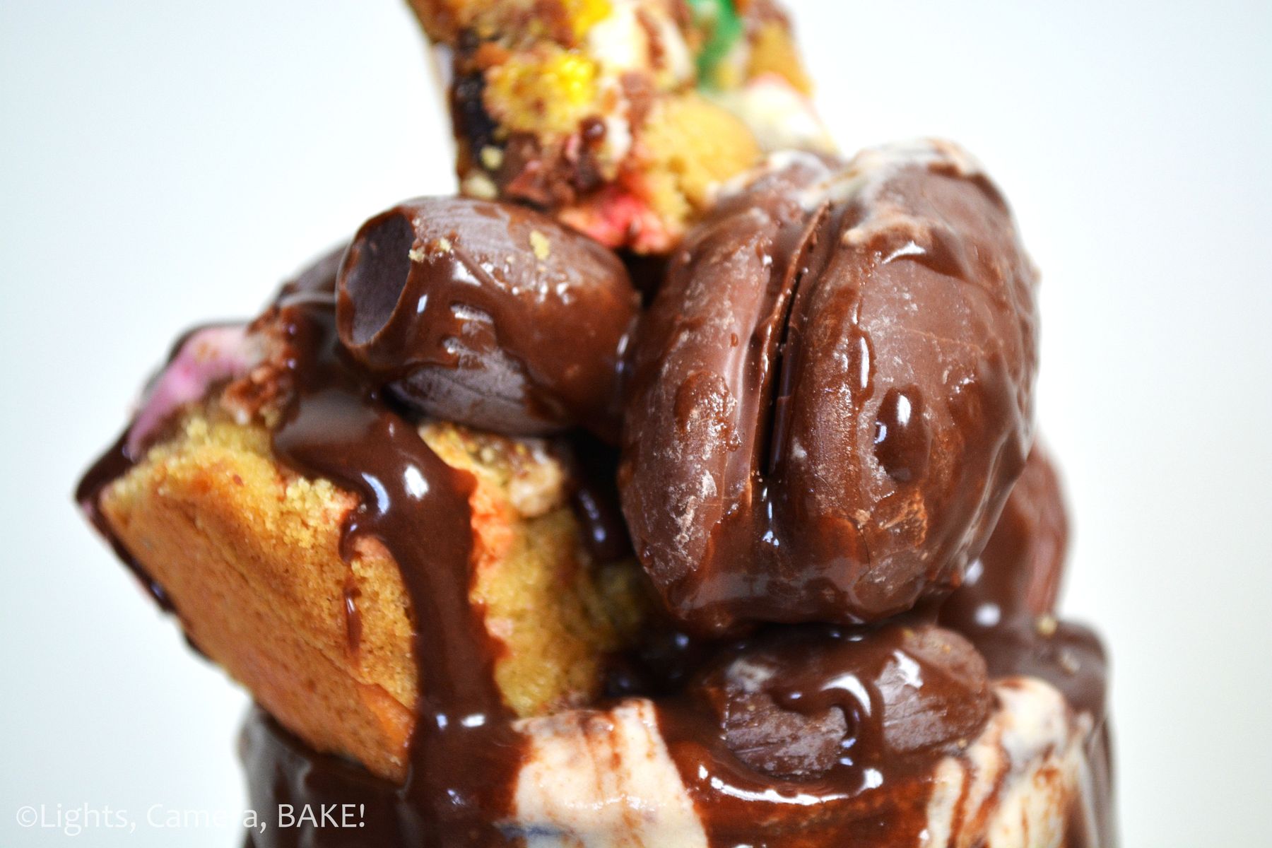 Homemade Easter chocolate ice cream that is then turned into a freak shake with mountains of homemade chocolate sauce and various Easter eggs and treats.