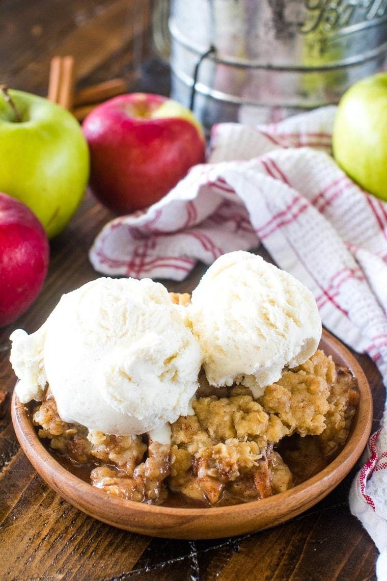 This quick and easy apple crisp recipe is full of juicy apples, cinnamon, sugar and the best part of all is the amazing oatmeal streusel on top! Grab your ice cream, warm apple crisp and dig into this easy dessert!