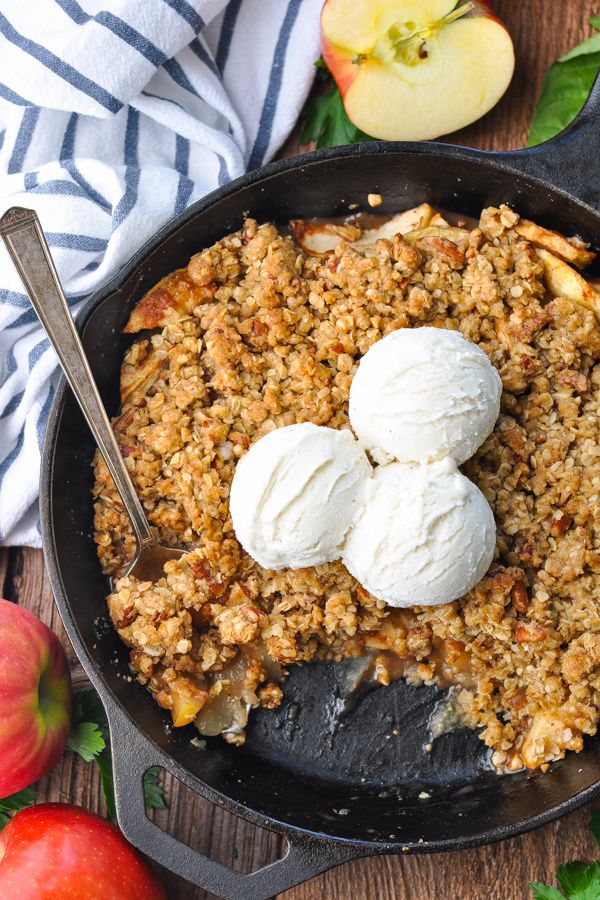 This Easy Apple Crisp recipe is the perfect way to enjoy a bounty of fresh fruit! Sweet and tart warmly spiced apples are topped with a buttery, crunchy oat streusel for a classic dessert that everyone loves. Bake the crisp in a skillet or in a dish, and serve warm with vanilla ice cream on top!