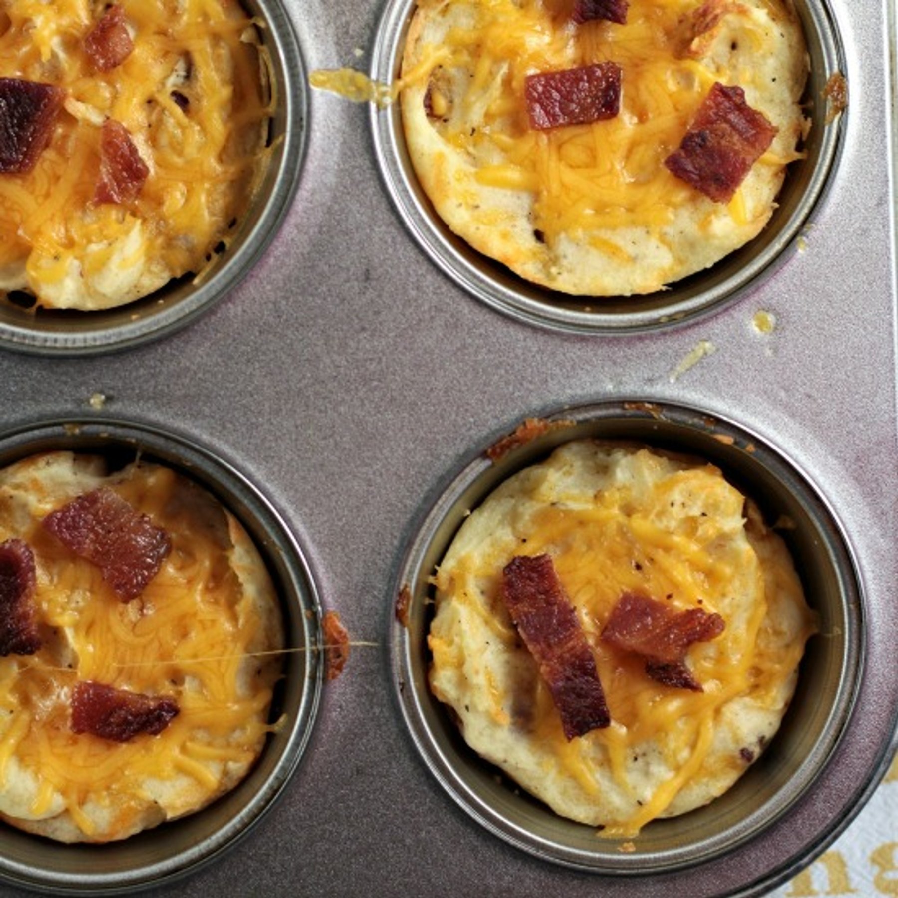 In a medium bowl mix mashed potatoes, 2 strips of crumbled bacon, 1 cup cheese, egg, salt and pepper. Divide between cups and lightly...
