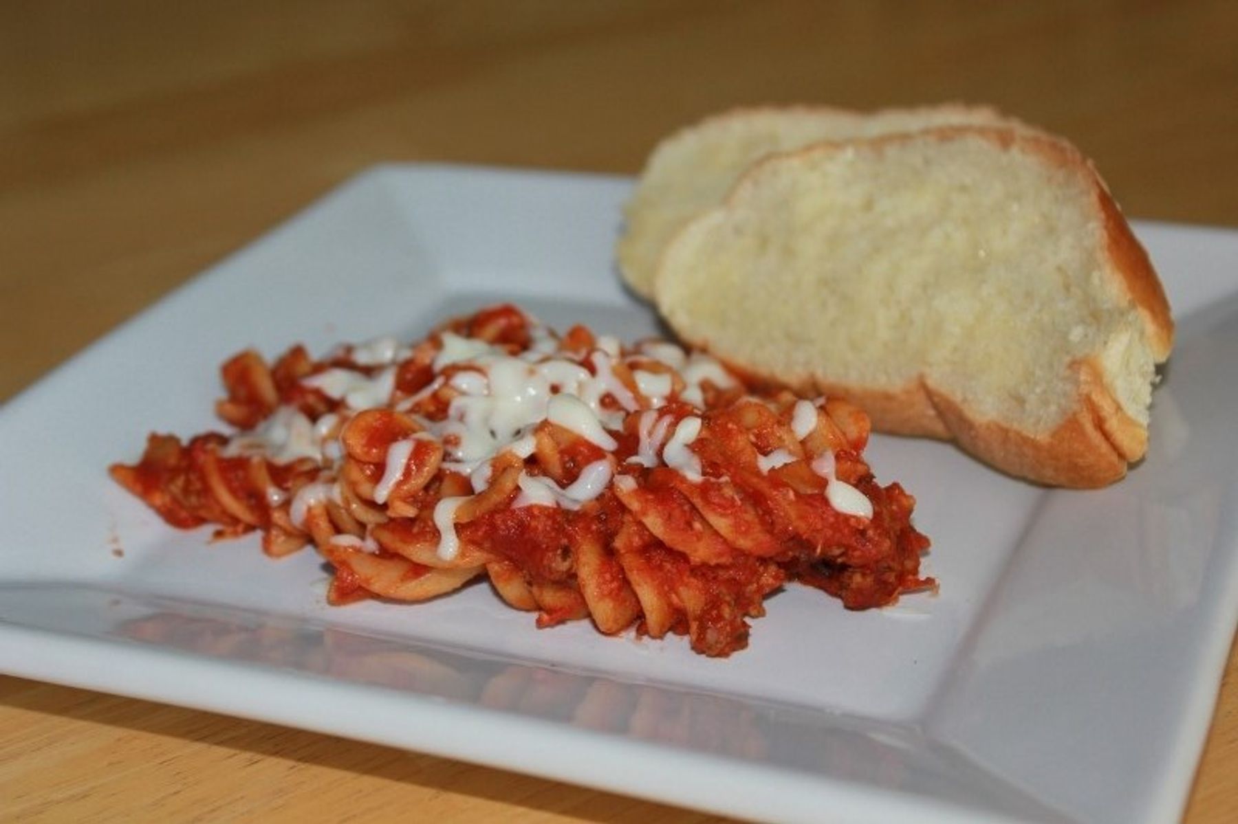 Boil pasta according to package (15 minutes). Drain pasta then return to pot on medium heat and add the spaghetti sauce. Stir in 1 1/2 C of mozzarella cheese until melted. Spread pasta and sauce into an 8x8 dish. Sprinkle with remaining mozzarella cheese and broil until cheese on top is melted .