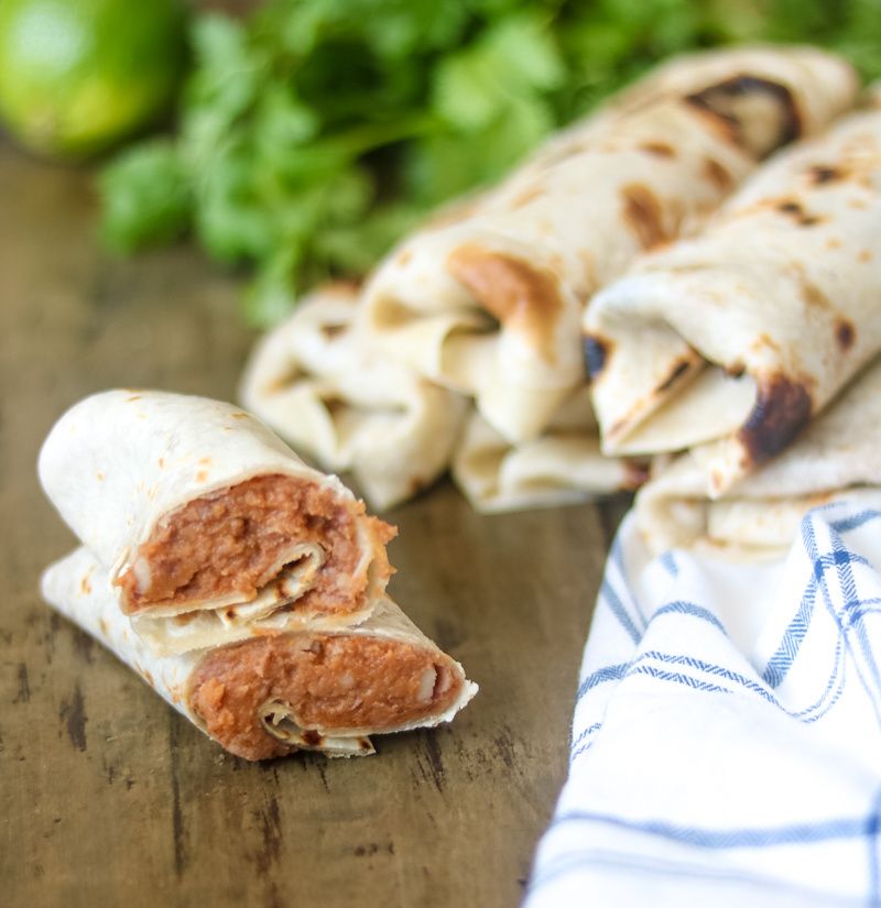 Easy Bean Burritos: Refried beans and pumpkin puree are mixed together with taco seasonings and stuffed into a flour tortilla for a healthier spin on a vegetarian burrito.