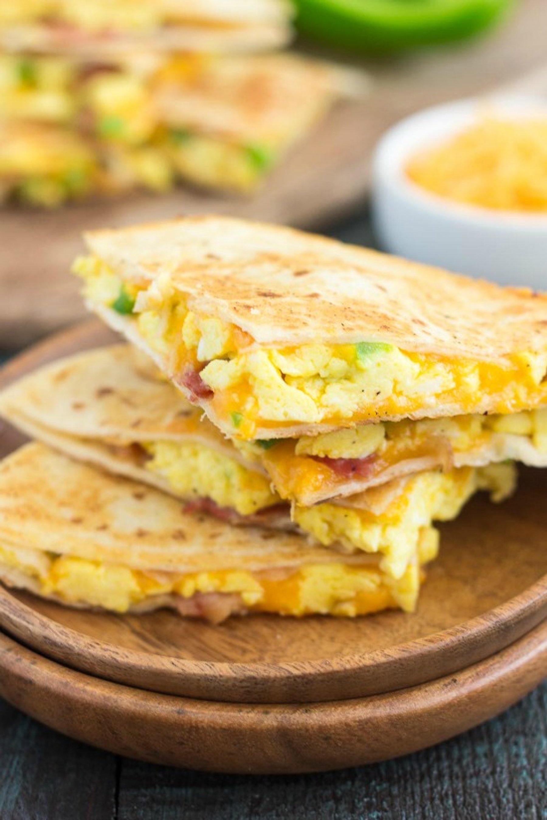 These Easy Breakfast Quesadillas are filled with fluffy, scrambled eggs, green peppers, bacon and cheddar cheeses!